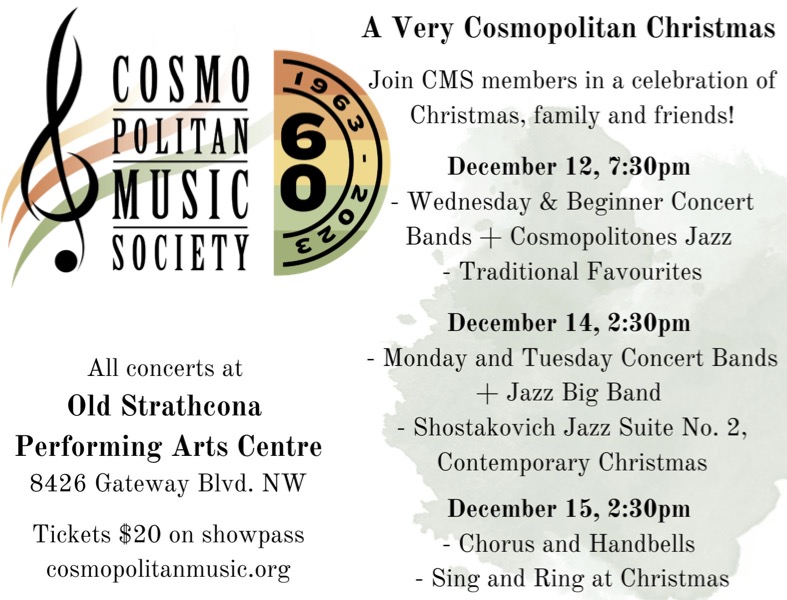 Join Cosmopolitan Music Society members in a celebration of Christmas, family, and friends. Thursday, December 12th at 7:30 pm – Wednesday and Beginner Concert Bands + Cosmopolitones Jazz performing traditional favourites. Saturday, December 14th at 2:30 pm – Monday and Tuesday Concert Bands and Jazz Big Band performing Shostakovich Jazz Suite No. 2 and contemporary Christmas songs Sunday, December 15th at 2:30 pm – Chorus and Handbells sing and ring at Christmas All concerts at Old Strathcona Performing Arts Centre Doors open one hour prior to concert start times 8426 Gateway Blvd. NW, Edmonton, AB Tickets are $20 available on Showpass cosmopolitanmusic.org