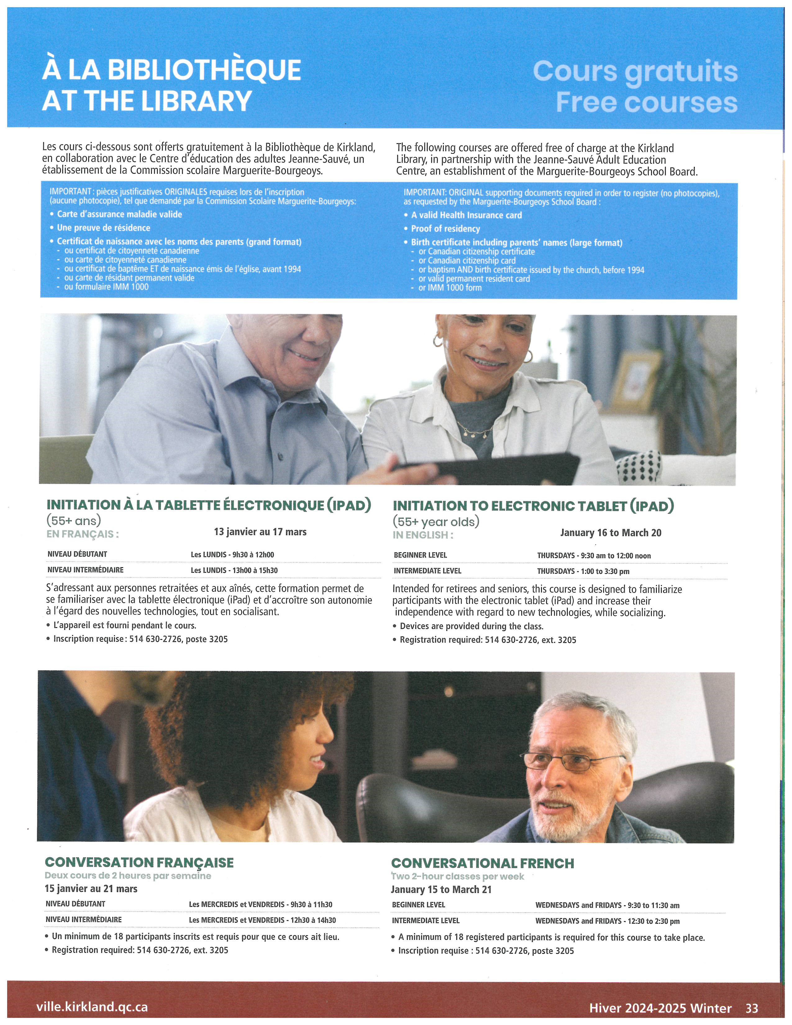 The following courses are offered free of charge at the Kirkland Library, in partnership with the Jeanne-Sauvé Adult Education Centre, an establishment of the Marguerite-Bourgeoys School Board. Registration is done in person only and priority will be given to Kirkland Residents until December 16th. Non-Residents may register from December 17th to January 6th inclusively. IMPORTANT: ORIGINAL supporting documents required in order to register (no photocopies), as requested by the Marguerite-Bourgeoys School Board (please referred to the attached document for more details). Please contact the library to know our holiday closures before coming in to register. Info: 514-630-2726, ext. 3205