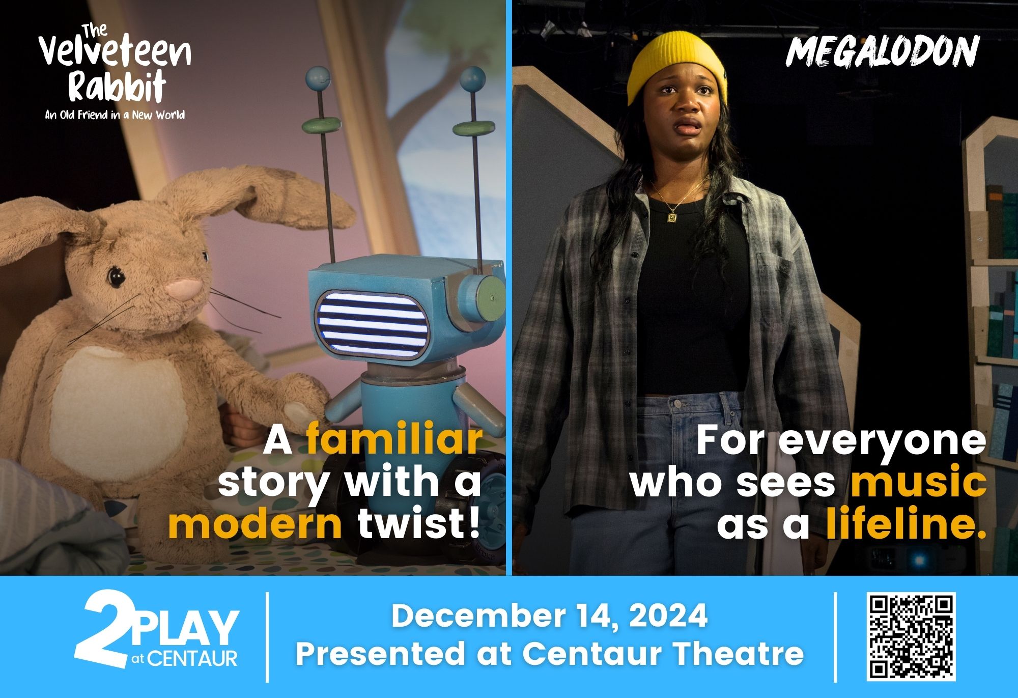 Since its departure in September, Geordie Theatre’s 2Play tour has already delighted hundreds of students and educators across Eastern Canada, and now it’s your turn to see the great Theatre for Young Audiences that’s been resonating with audiences of all ages! Catch The Velveteen Rabbit: An Old Friend in a New World (ages 5+) and Megalodon (age 13+) at Centaur Theatre for this special one-day event on December 14th, 2024.
