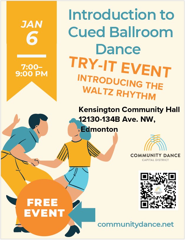 DATE: January 6, 2025 TIME: 7-9pm LOCATION: Kensington Community Hall 12130 134B Ave NW Edmonton EVENT: FREE ‘Try-It! Event’! This is a FREE event hosted by CDCDA, no registration required, no dancing experience required. Learn the basic steps of CUED BALLROOM! Bring your partner and come on out! FREE parking EMAIL: cdcdainfo@gmail.com PHONE: 5875213386 WEBSITE: communitydance.net https://www.communitydance.net/