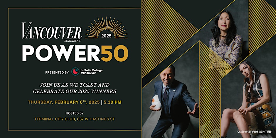 Every year, Vancouver Magazine’s Power 50 list celebrates our city’s changemakers. Join us for the big reveal of this year’s honourees—alongside Vancouver’s most impactful movers and shakers—at a reception and awards ceremony Thursday, February 6, 2025, at the Terminal City Club. This exclusive event includes a stand-up networking dinner, setting the stage for an evening of connection and celebration. The wine (and Duchess cocktails!) will be flowing—and so will the conversation. Of course, the highlight of the night will be the awards presentation for the Power 50 winners; we’ll be recognizing our city’s 2025 changemakers, as well as inducting a new group of Hall of Fame honourees and Ones to Watch. Winners of the Vancouver Magazine Power 50 are the people powering our city, in politics, art, activism, business, philanthropy and beyond.These are the powerhouses who are propelling Vancouver into the future, and we’re excited to raise a glass to each and every one. Tickets go fast for this exclusive event, so grab yours before it’s too late. It’s the ultimate power move.