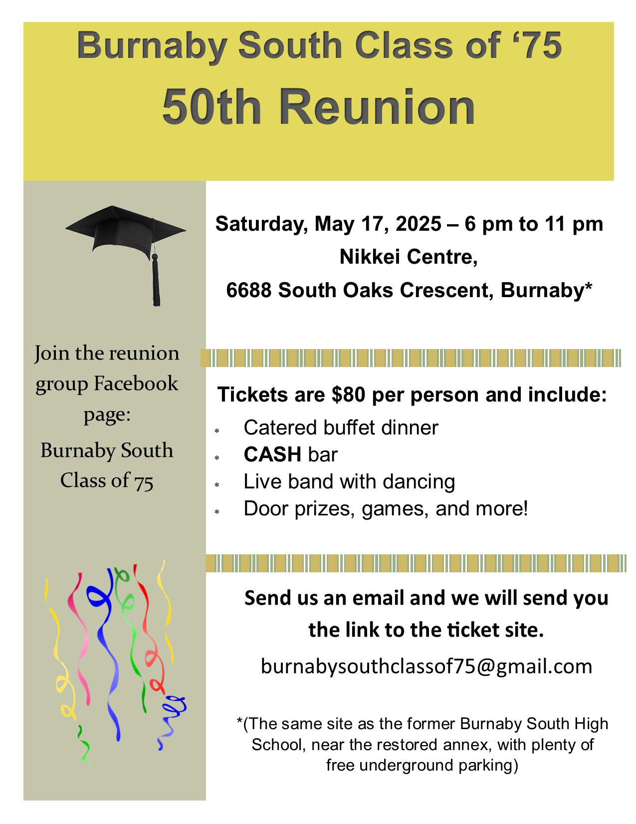 The Burnaby South class of ’75 is celebrating our 50th reunion on May 17th, 2025 and we’re looking for grads (and almost grads) to attend. The event will be at the Nikkei Ctr in Burnaby, from 6 pm to 11 pm, and will include a catered buffet dinner, live band, cash bar, games and prizes. Tickets are $80 pp and can be purchased by contacting us (the reunion committee) through our email address burnabysouthclassof75@gmail.com. Tickets cannot be purchased without contacting our email address. We also have a Facebook group, specifically for the class of ’75 – https://www.facebook.com/groups/377807511615330 Join us in commemerating 50 years since we left Burnaby South and the days when we didn’t realize we were making memories, we were just having fun! Meet up with old friends you’ve missed for all these years, swap stories, and catch up on what they’ve been up to for all these years.