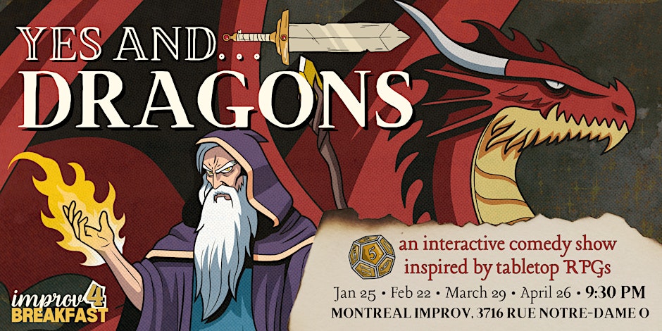 Yes And…Dragons is a completely improvised spectacle that mixes the thrill of tabletop games such as Dungeons & Dragons and Pathfinder, with the hilarity and spontaneity of improvised comedy. Join us for the first season of this four-part epic, unfolding over four months. Dive into a riveting interactive narrative filled with suspense, laughs, daring escapades, and the luck of dice rolls Adventure Dates January 25th, February 22nd, March 29th, and April 26th, all at 9:30PM TICKETS $15 LOCATION 3716 Notre-Dame St W, downstairs LANGUAGE This show will take place in English AGES 18+