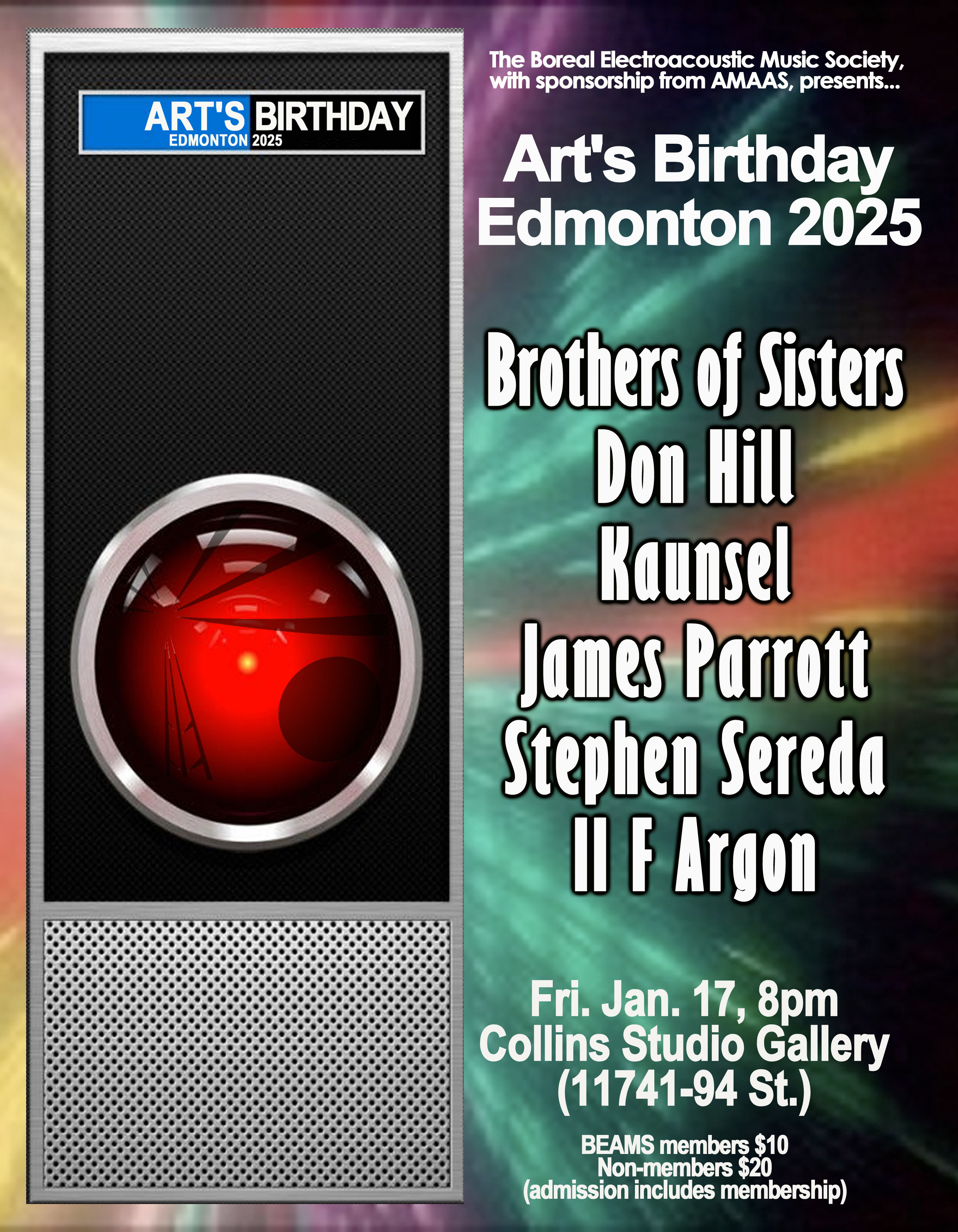 For Immediate Release January 13, 2025 BEAMS to host an international art celebration One of the world’s most unusual celebrations of art is slated to take centre stage in the Alberta capital. Art’s Birthday Edmonton 2025, facilitated by the Boreal Electroacoustic Music Society, holds court Friday, Jan. 17 at 8 p.m. at Collins Studio Gallery (11741-94 Street). The show will feature a wide range of Edmonton sound artists and experimental musician, many of whom have garnered international reputations for their work. Scheduled to play the event are Don Hill, Josh Klassen, James Parrott, Stephen Sereda, Kaunsel and II F Argon. BEAMS has hosted this annual event in Edmonton since 2010, as part of a global tribute to art, an idea conceived by French surrealist Robert Filliou in 1963. He believed that a million years ago, art did not exist until a sponge was dropped into a pail of water, and picked his own birthday, Jan. 17, to celebrate the occasion. Charmed by the absurdity of the notion, artists, predominantly in Europe, have been celebrating Art’s Birthday ever since. A comprehensive background of the event and international listings are available on artsbirthday.net. Admission to Art’s Birthday Edmonton 2025 is $10 for BEAMS members and $20 for non-members, although a BEAMS membership is included in the latter price. Media Contact: Shawn Pinchbeck, President, BEAMS info@beams.ca