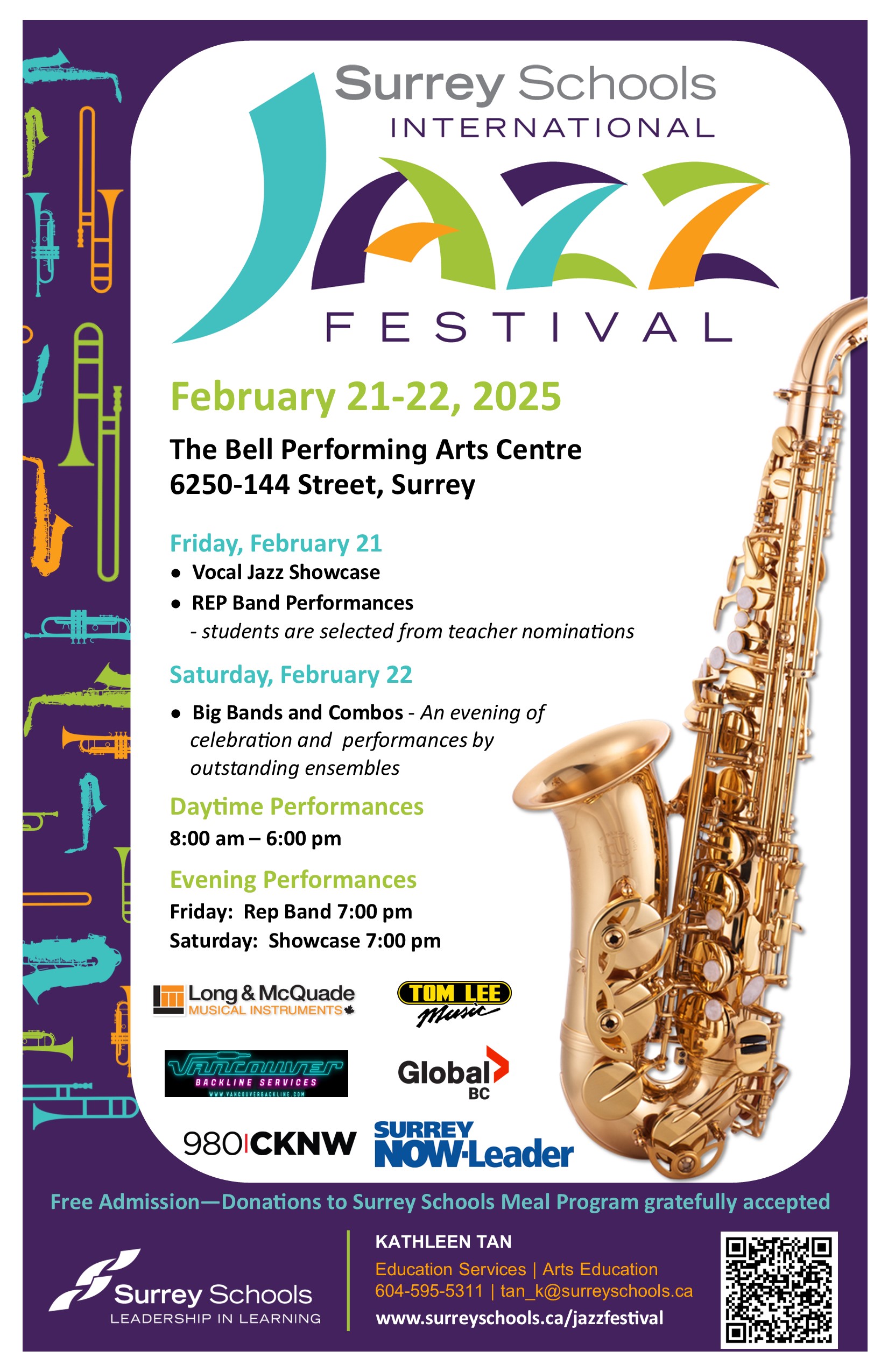 The Surrey Schools International Jazz Festival is kicking off on February 21 – 22, 2025 all day at the Bell Performing Arts Centre & Sullivan Heights Secondary. This is one of Canada’s largest and most unique educational jazz festivals, combining two days of jazz performances by over 2200 talented secondary school students with two days of superb jazz performances for the public. Free admission to all performances, donations to Surrey Schools Meal Program gratefully accepted. Visit the http://www.surreyschools.ca/jazzfestival for showtimes.