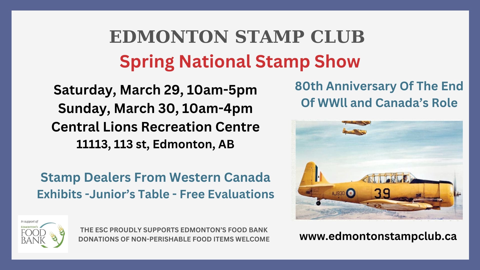 The Edmonton Stamp Club is hosting their 2025 Spring National Stamp Show March 29-30, at the Central Lions Recreation Centre at 11113 – 113st in Edmonton, Alberta. The theme for this year’s ESC Show, “The 80th Anniversary of WWll and Canada’s Role”. Show hours are Saturday March 29, 10:00am-5:00pm & Sunday March 30, 10:00am-4:00pm, admission is $2.00 and parking is free. The 2025 show will feature Dealers from across Western Canada, competitive exhibits, circuit books and a juniors table. Free stamp appraisals will also be offered during event hours. The ESC is accepting non-perishable food donations during the Show in support of Edmonton’s Food Bank. Attendees are encouraged to bring donations to help those in need within the community.