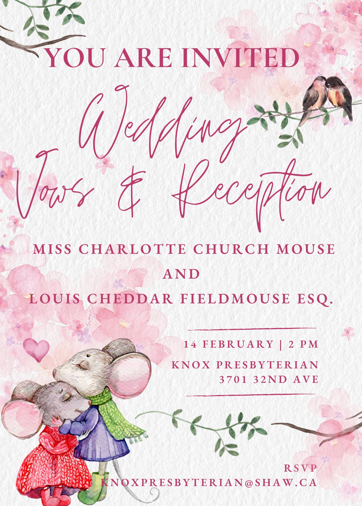 Celebrate Valentine’s Day with a “Mousy” Mock Wedding at Knox Presbyterian Church (3701 32nd. Ave.) Charlotte our Church Mouse is getting married! FREE. This family friendly event is for young and old alike. Dress up if you like. Reception. Friday, February 14th at 2PM. RSVP 250-307-2127.