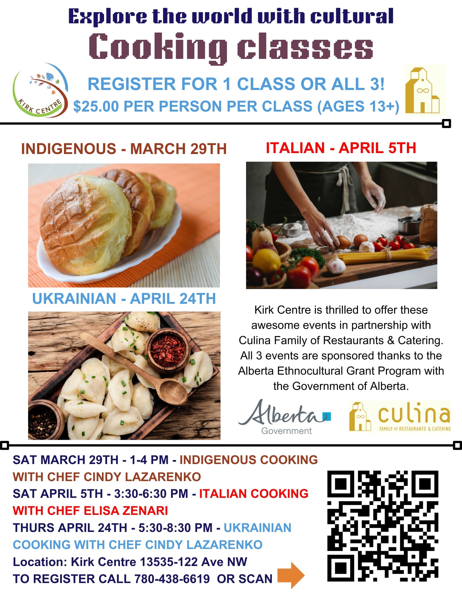 Kirk Centre is thrilled to offer three awesome events in partnership with Culina Family of Restaurants & Catering. Saturday March 29th from 1-4 pm – Indigenous Cooking classes featuring Bannock Tacos with Chef Sindy were you will make Indian Tacos with bannock (fry bread), ground bison, toppings to include corn salsa, grated smoked cheddar, pickled onions, dill sour cream, wild herb salsa, toasted pumpkin seeds Saturday April 5th from 3:30-6:30 pm – In the Italian class with chef Elisa you will make Simple Italian Sauces to level up your culinary game! Pesto, Besciamella, Caponata and Aglio e Olio. Thursday April 24th from 5:30 to 8:30 pm – The Ukrainian class with chef Allison, you will make a vegetarian borscht (knife skills) and pyrohy with potato and cheddar filling. Toppings can include sour cream, bacon bits, caramelized onions, other. Sign up for one, two or all three!