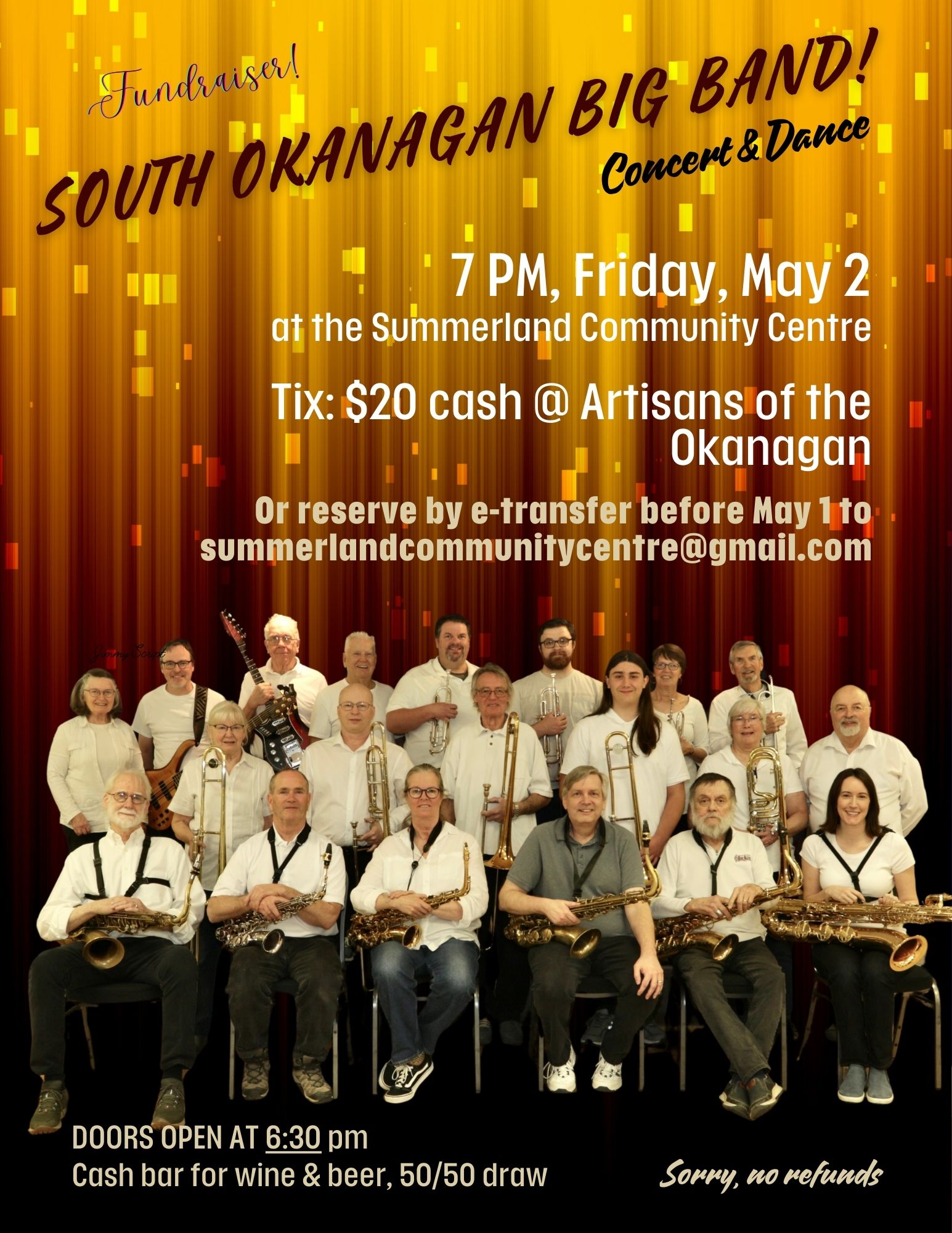 The South Okanagan Big Band rehearses regularly at the Summerland Community Centre and has become the Centre’s “house band” as well as a community favourite. Each concert the band has put on has been enthusiastically received. Recent shows have all sold out! The Big Band configuration – 5 saxes, 4 trombones, 4 trumpets and a rhythm section – has its roots in 1940’s jazz and backed the likes of Doris Day, Frank Sinatra, and Tony Bennett singing the old standards. At the last band concert, the unusual addition of 1940’s style “The Andrews Sisters” singers received enthusiastic response, and they may just make a reappearance. The bands of the day also performed instrumentals, featuring talented soloists. But besides the old standards, the South Okanagan Big Band endeavours to include music charts to entertain in other genres, including some rockier tunes as well. New band leader, the talented Neil Bateman, now waves the baton to conduct the band. He has introduced the band to some of his own fabulous arrangements of music, too. Band members happily contribute their time and talents to this evening, and all proceeds go to the benefit of the Community Centre. Wrap your heart in that! Don’t miss this entertaining show! Your ears will delight with full and rich sounds for a couple of hours the evening of Friday, May 2 (7PM). You’ll find a cafe-style ambience, beer and wine for sale, and you’ll have the chance to participate in a 50/50 draw. Tckets are $20 (or $15 for SCCA members who show their membership card) and are available in person at Artisans of the Okanagan in Summerland. You can also reserve tickets via e-transfer to summerlandcommunitycentre@gmail.com. Please include the date of the show and specify the number of tickets you wish to reserve. And don’t forget your dancing shoes. Just in case jiggling in your seat and foot tapping doesn’t quite cut it! See you there!