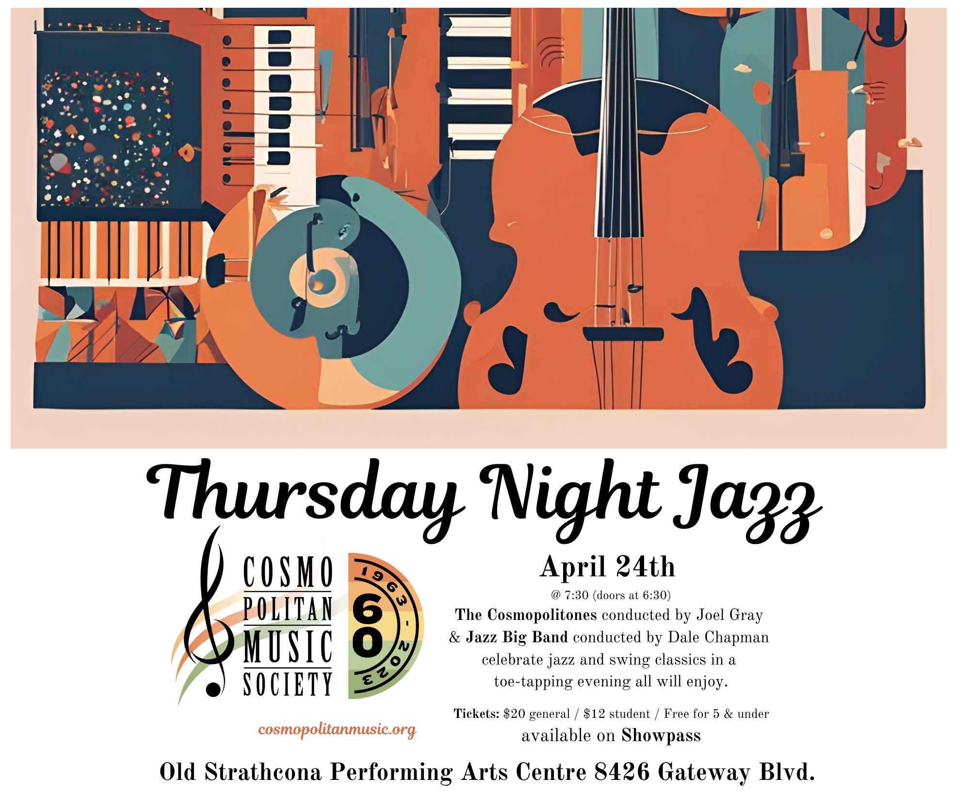 Cosmopolitan Music Society is pleased to present a Thursday Night Jazz Party. Join us for a night of Latin Jazz performed by the CMS Jazz Big Band (conducted by Dale Chapman) & the Cosmopolitones (conducted by Hannah Gray)