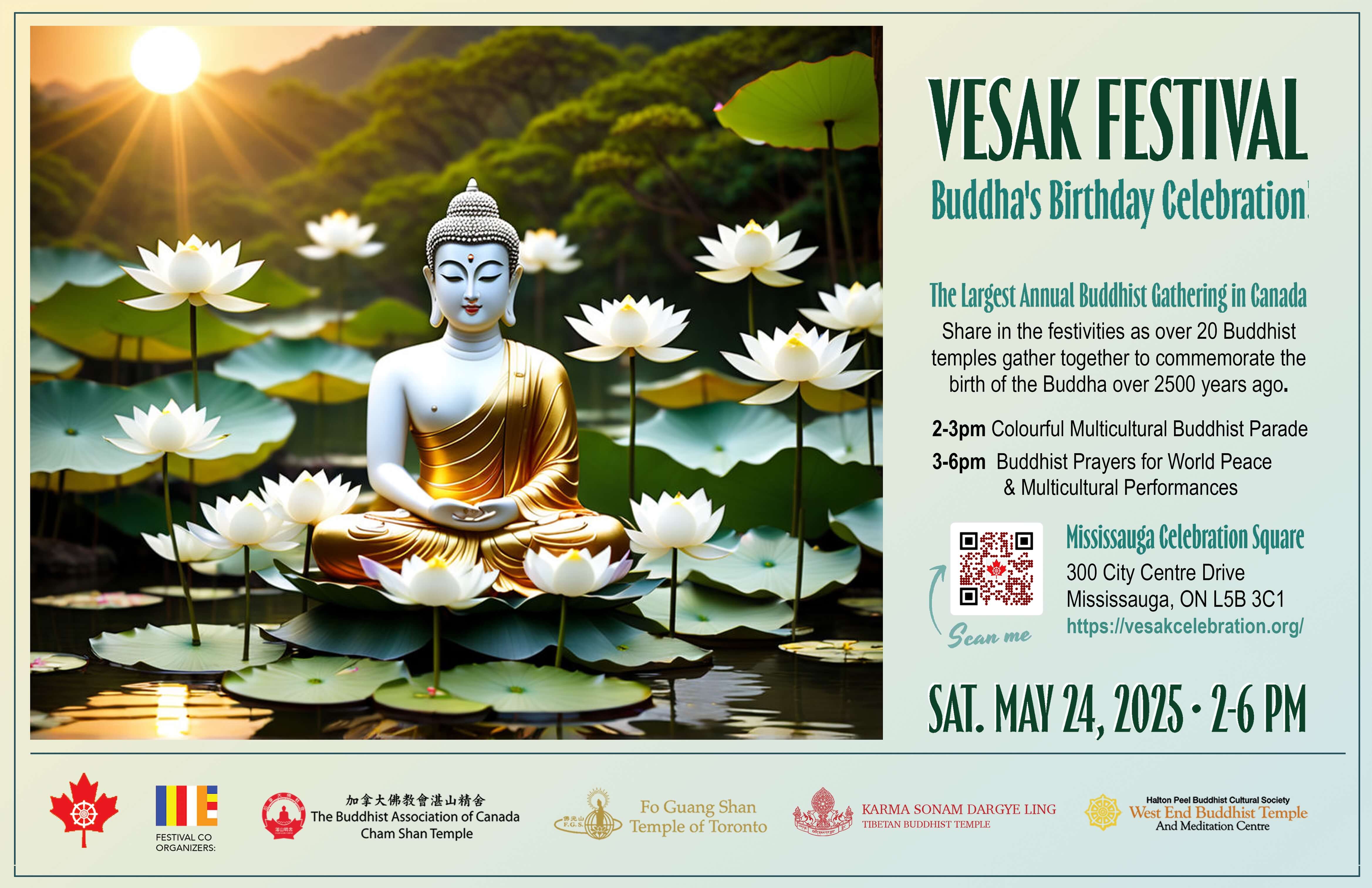 Come join us at Mississauga Celebration Square for a vibrant celebration of Buddha’s birthday at the Vesak Festival 2025! Immerse yourself in a multicultural experience filled with uplifting cultural music and spiritual dance performances, sacred chanting ceremonies and traditional rituals including the symbolic Bathing the Buddha ceremony. Witness a colorful parade of unity and devotion uniting more than 100 monastics, 25 Buddhist temples and centres. Discover temple exhibits featuring spiritual practices, join in short meditations, and speak with monastics and lay teachers. This outdoor free event promises to be a memorable gathering of diverse communities coming together to honor a significant day in Buddhist culture. Whether you’re Buddhist or simply curious, we invite you to come experience this one-of-a-kind celebration bringing together temples, traditions, and communities for a day of inspiration and unity.
