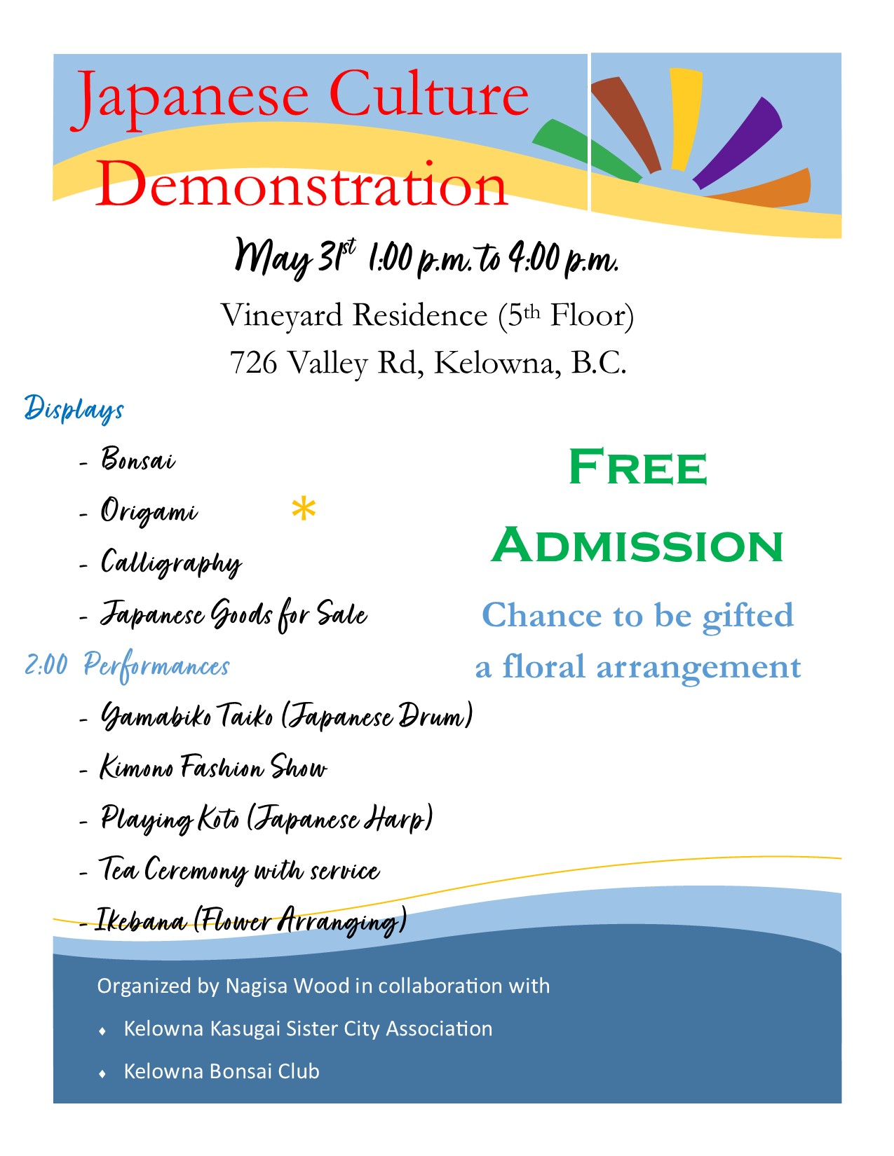 An amazing display of Japanese Culture featuring a Kimono fashion show! There will also be demonstrations of Ikebana, Yamabiko Taiko, Tea Ceremony and Koto. You will also find displays of bonsai (Kelowna Bonsai club) Origami, Calligraphy and more. This event is free to the public