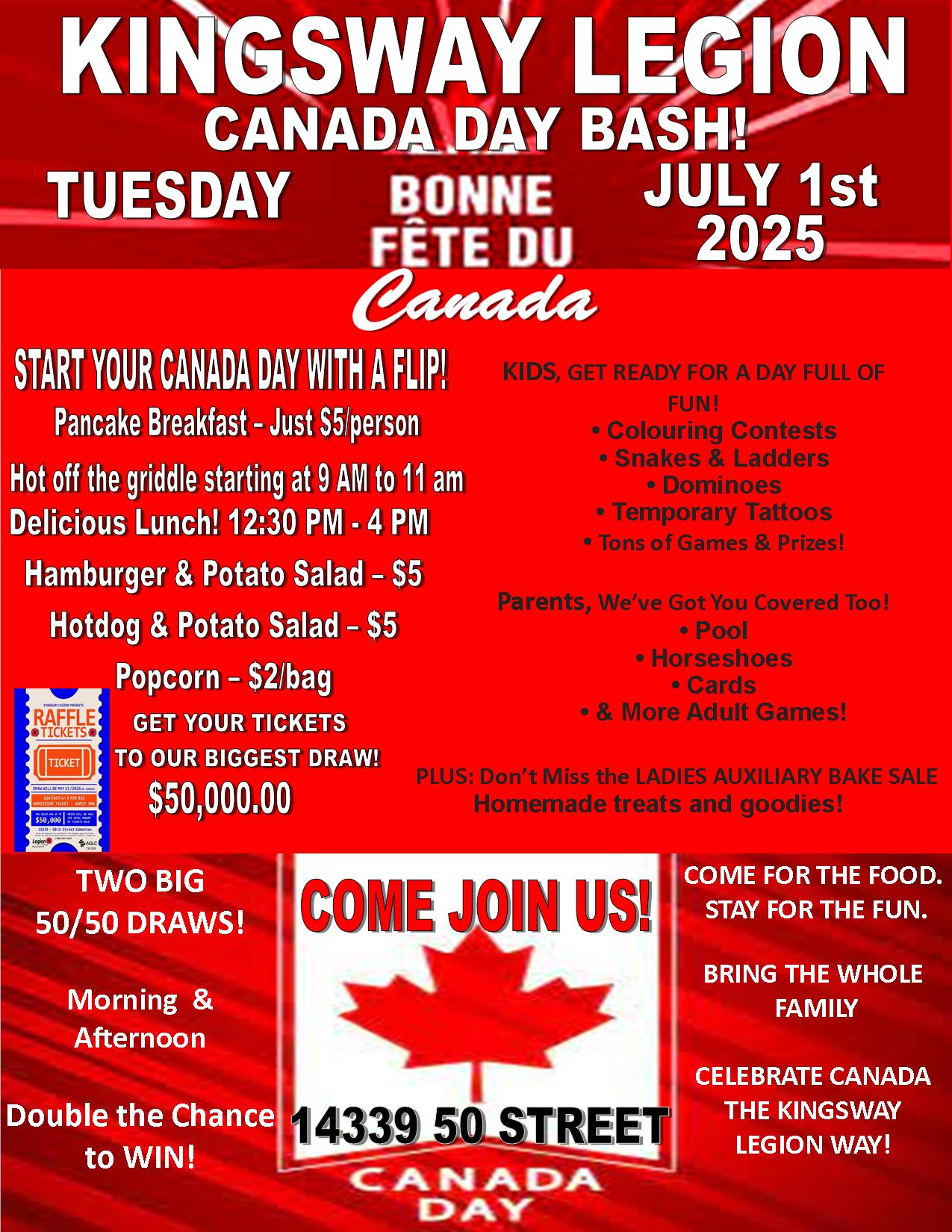 Canada Day Celebration at the Kingsway Legion This is a Big Fundraiser! This is a large event open to all ages 0-99, lots of family orientated fun! There will be special guests, lots of games, prizes and great food starting with a pancake breakfast. Come out and join the family fun!