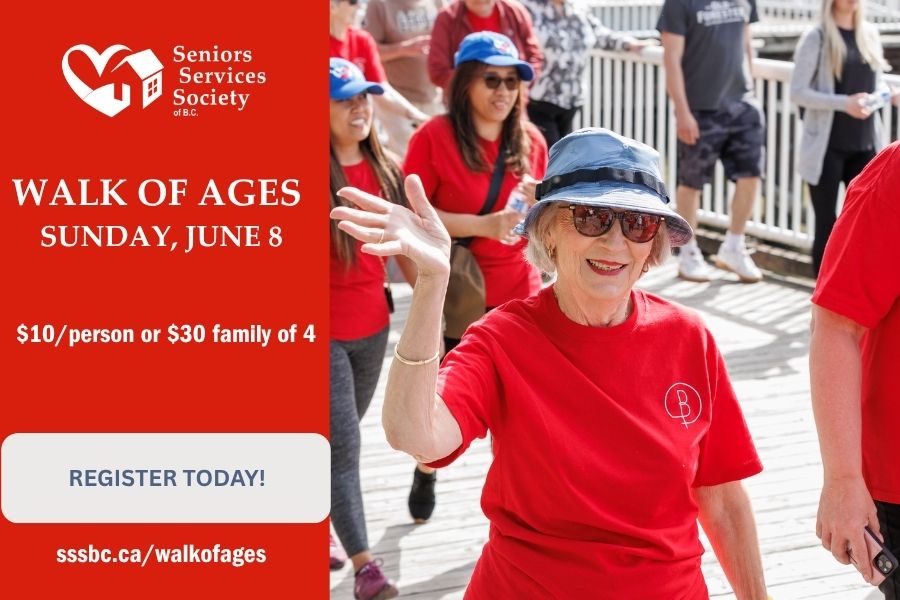 Join the Walk of Ages fundraiser hosted by the Seniors Services Society of BC to support vulnerable seniors in our community and help ensure they never face homelessness. Walk with us on Sunday, June 8th at Mercer Stadium and Track (900 6th Street, New Westminster). Check in at 9:00am, walk from 10am – 12 noon. Enjoy live music from DJ Alibaba, refreshments, goodie bag, door prizes and a 50/50 draw. Registration: $10/person or $30 for a family/team of 4 people. Don’t miss out on this fun and meaningful event — together, we can make a difference!