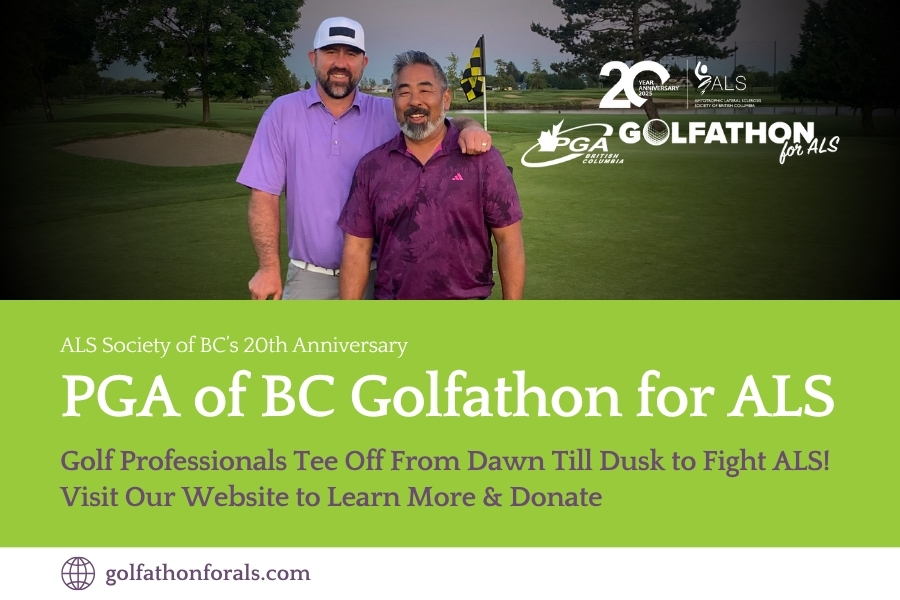The 20th Annual PGA of BC Golfathon for ALS fundraiser supports patients, their families and caregivers in BC and Yukon. Golf professionals across BC in the month of June, will tee off from dawn till dusk to raise awareness and funds. Every shot taken will contribute towards helping the ALS Society of BC make a difference. Please visit http://www.golfathonforals.com to learn more & donate.