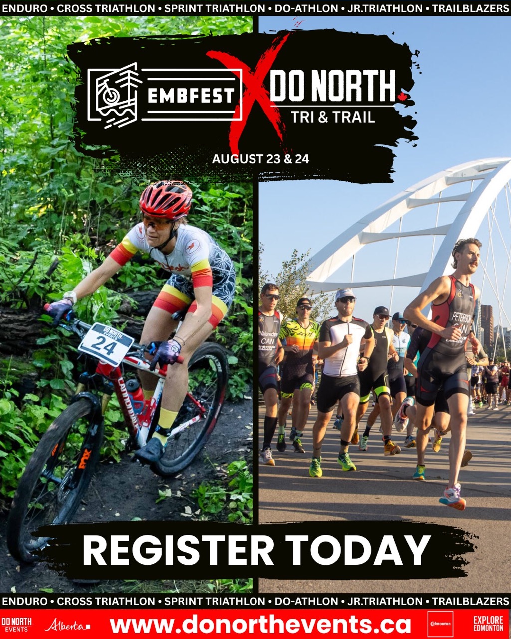 Join us for the Do North Tri & Trail, in partnership with EMBFest, August 23 & 24 at Kinsmen Park. Whether you’re a fierce competitor or new to the sport, this event has something for everyone! 7 Exciting Races: From on-road to off-road, join our celebration of multisport, triathlon and mountain biking. Race our classic Do North Sprint Triathlon, or hit the trails for our Do North Do-athlon and our brand new Do North Cross Triathlon. Team events and youth races are also on the program. Family Fun: Group rides, beer gardens, bike seminars, an expo, and a bike rodeo will all be on offer for FREE family fun! Mark your calendars, rally your crew, and join us for an epic weekend in Edmonton’s river valley. Info and race registration at donorthevents.ca.