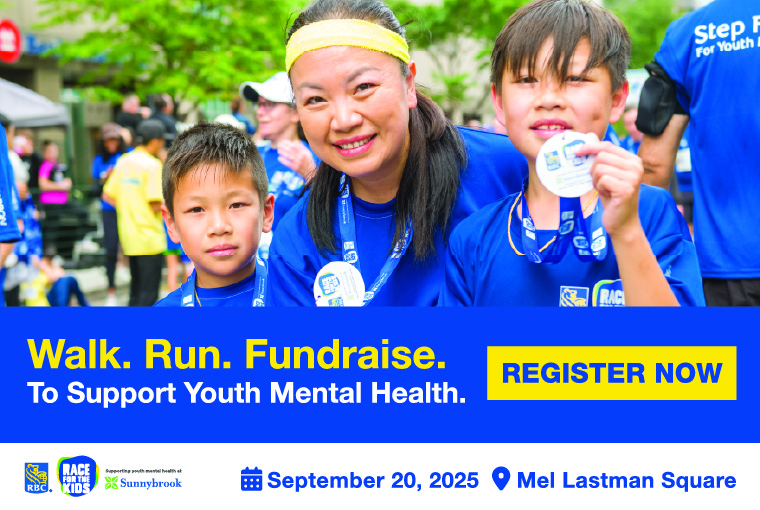 Register for the RBC Race for the Kids to make a difference for youth in our community. Join in on the fun and bring along your family and furry friends to walk, stroll or run just 5 KM, and step forward for youth mental health. All proceeds and donations from the race directly supports Sunnybrook’s Family Navigation Project (FNP). FNP is a donor-funded program that connects youth and families with clinically trained navigators who quickly help them access the right mental health and addiction support services.