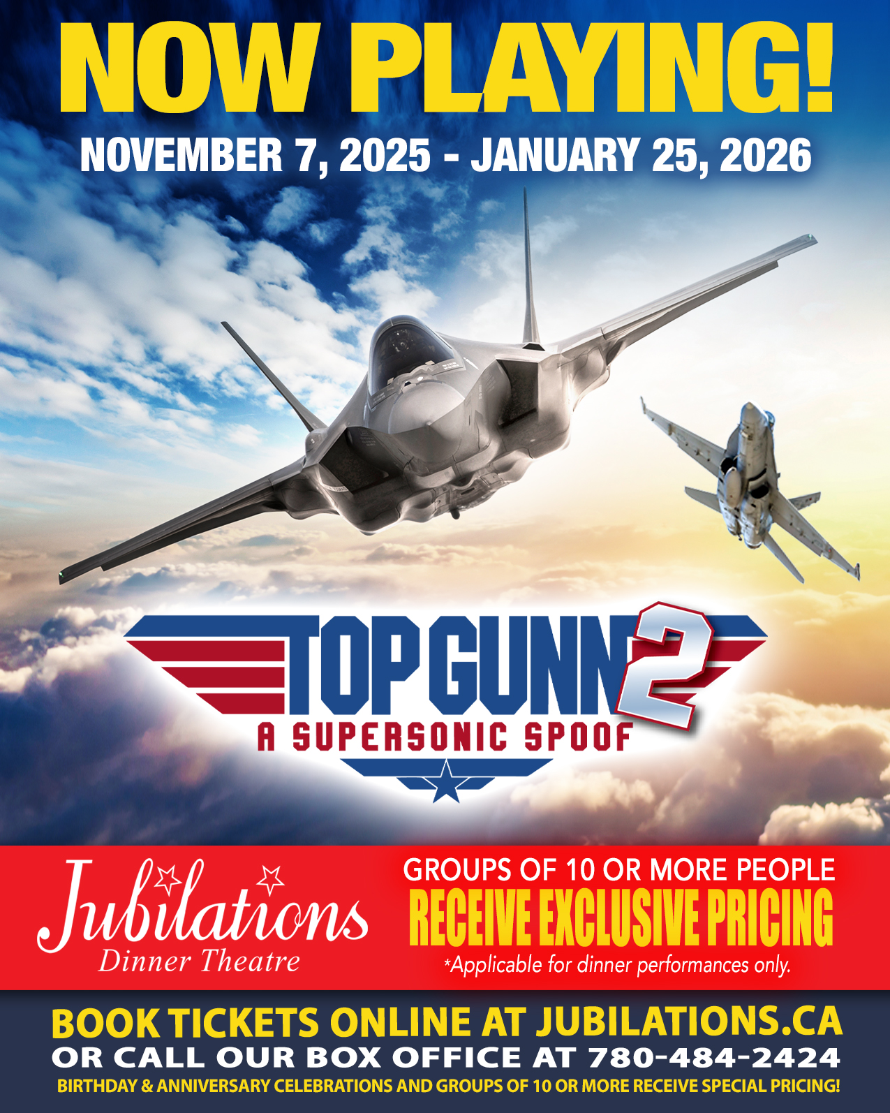 Get ready to blast off again, down the highway to the danger zone. Canada’s Top Gunn pilots are ready to help Maverick save the day one more time. It’s an ALL NEW mission set to the greatest hit songs of the 80’s. At Jubilations Dinner Theatre we feel the need… the need for fun! Jubilations Dinner Theatre presents Top Gunn 2: A Supersonic Spoof! Take in the excitement and stunning live vocals while you enjoy a delicious multi-course meal served by our character servers. It’s a live show so anything could happen. Play along and the actors might just include you in the act!