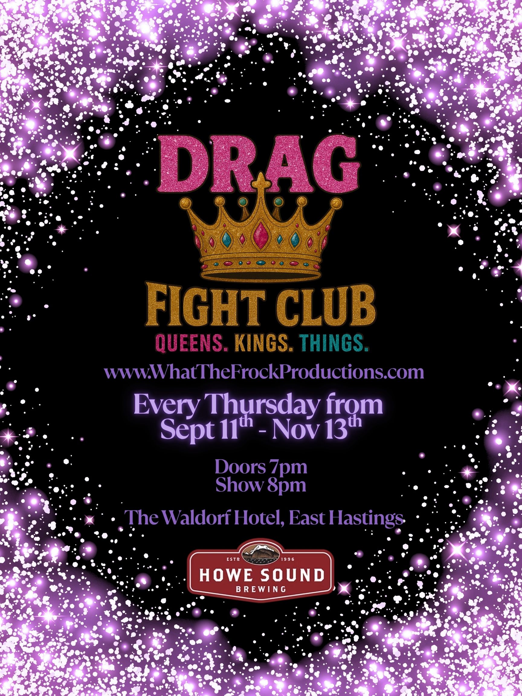 Welcome to Drag Fight Club 2025! Come join us at Howe Sound Taphouse & Kitchen – East Van for an epic night of fierce lip-sync battles, jaw-dropping performances, and fabulous drag performers slaying the stage. Get ready to witness the ultimate showdown as these performers bring their A-game and battle it out for the crown. Whether you’re a seasoned drag aficionado or a first-time spectator, Drag Fight Club 2025 promises to deliver an unforgettable evening of glamour, glitter, and fierce competition. So grab your friends, put on your fiercest outfit, and get ready to cheer on your favorites! Now in it’s 3rd year, with 30 competitiors, the competition is BIGGER, BOLDER & BETTER! Shining a spotlight on Kings, Queens & Things, the variety in Drag Fight Club is BEYOND! Sept 11 – Kings round 1 Sept 18 – Queens round 1 Sept 25 – Things round 1 Oct 2 – Kings round 2 Oct 9 – Queens round 2 Oct 16 – Things round 2 Oct 23 – Semi Finals Groups 1 + 2 Oct 30 – Semi Finals Groups 3 + 4 Nov 6 – Semi Finals Groups 5 + 6 Nov 13 – Grand Final Sponsored and supported by local and small businesses, What The Frock Productions are absolutely thrilled to be back, bringing you the BEST friendly Drag competition in Canada. Howe Sound Taphouse & Kitchen S&K Collective Metropolitan Hotel Vancouver Samesun Hostels Sriracha Revolver Compulsive Ink Tattoos Flare Events Foxy Box Patrick Stark Posters JQ Clothing Iron and Blood Selfography