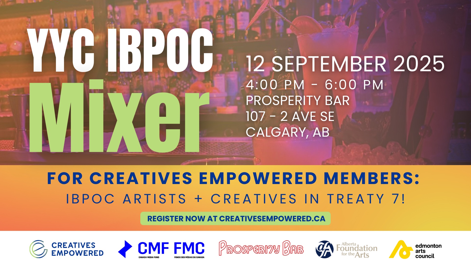 Join us for a Creatives Empowered IBPOC Mixer in YYC! Friday September 12 – 4pm to 6pm Prosperity Bar, 107 – 2 Ave SE, Calgary, AB This event is for Creatives Empowered Members (IBPOC Content Creators, Artists & Creatives) – who live, work and play in Treaty 7 Territory. This event is being offered free of charge, and your ticket includes 1 drink and appetizers. Please secure your spot now, and join us for this casual, fun, by-and-for IBPOC Mixer at the beautiful Prosperity Bar. Space is limited, and tickets are specifically for Creatives Empowered Members. IBPOC Content Creators, Artists & Creatives can sign up for free membership at creativesempowered.ca/join. CE offers free lifetime membership to individuals in Alberta that self-identify as Black, Indigenous and People of Colour / Racialized, including 2SLGBTQIA+, People with Disabilities and women. Join our strong and growing community of close to 300 IBPOC members! Get your ticket now before they’re gone!