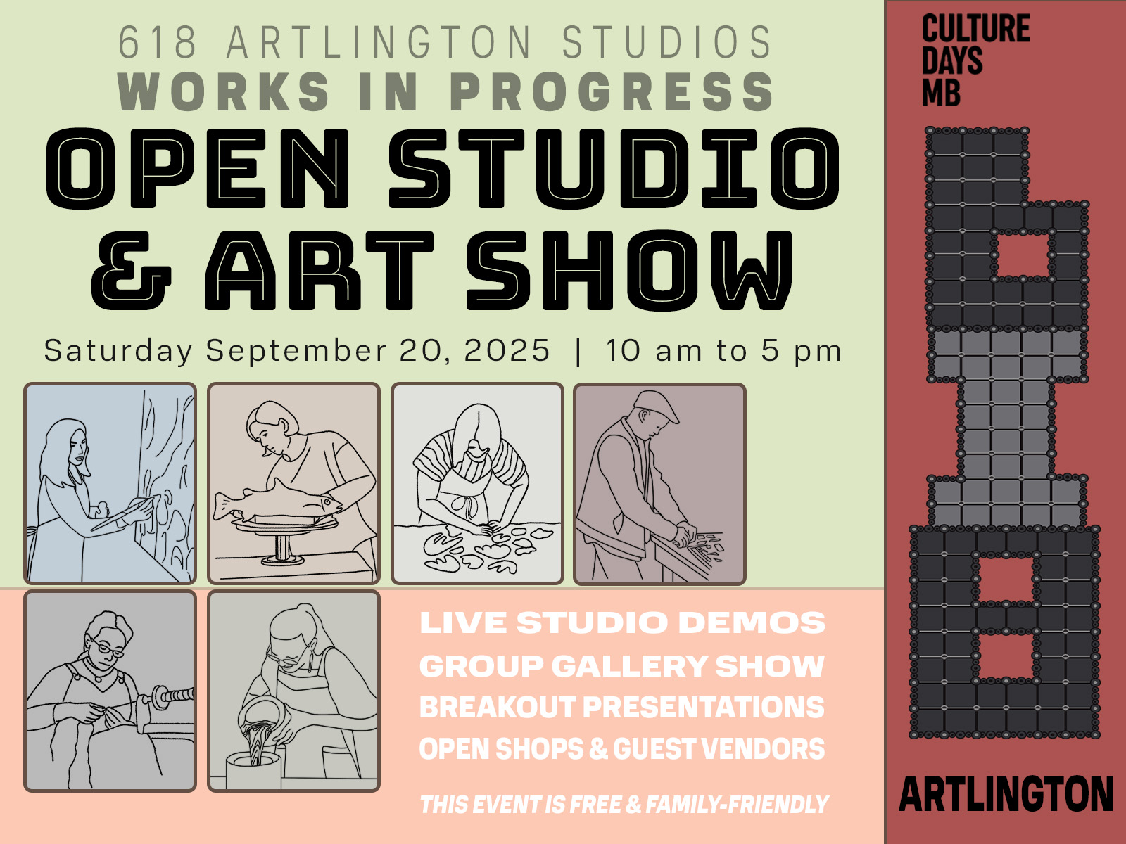 618 ARTlington is a community of Winnipeg artists in ceramics, textiles, paint, glass & more. Since 2012, we’ve been home to many artists & have hosted numerous events, opening to the public only during special events like this one. For this year’s Culture Days, we’ve planned a family-friendly day full of activities and experiences you won’t find elsewhere. 19 Resident Artists 10 Guest Vendors Gallery Show with special guest Bev Pike In-Studio Demos Breakout Sessions Kids activities Free event (no ticket required) | Not wheelchair accessible | Street parking available