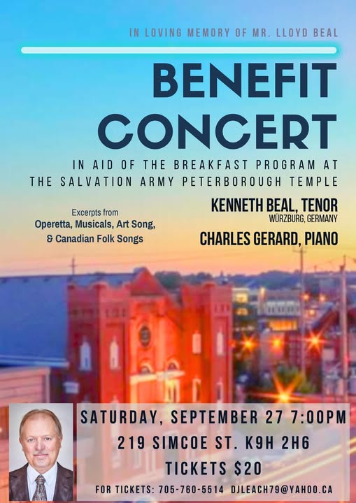 The Benefit Concert is sponsored by the family of Lloyd Beal, Kenneth’s father, who volunteered many hours for the Breakfast Program. ALL ticket money and donations collected as a result of the concert will go directly to support this much-needed program. The Peterborough Salvation Army Trust Board has agreed to match dollar for dollar the amount of money raised through the concert. So a $20 ticket becomes a $40 donation!