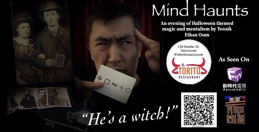 Yoosik Ethan Oum, a professional corporate magician and mentalist, presents a Halloween themed show of mentalism that is very interactive so the magic can’t happen without you. Take part in a mock seance, participate in a murder mystery, and divine clues to a cold serial killer case! Doors open 6:30pm for food /drinks. NOTE: food and drinks not included with ticket purchase.