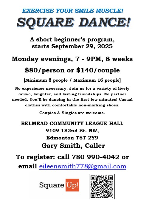 A short beginner’s program, starts September 29, 2025 Monday evenings, 7 – 9PM, 8 weeks $80/person or $140/couple [Minimum 8 people / Maximum 16 people] No experience necessary. Join us for a variety of lively music, laughter, and lasting friendships. No partner needed. You’ll be dancing in the first few minutes! Casual clothes with comfortable non-marking shoes. Couples & Singles are welcome. BELMEAD COMMUNITY LEAGUE HALL 9109 182nd St. NW, Edmonton T5T 2Y9 Gary Smith, Caller To register: call 780 990-4042 or email eileensmith778@gmail.com https://www.communitydance.net/square-up.html