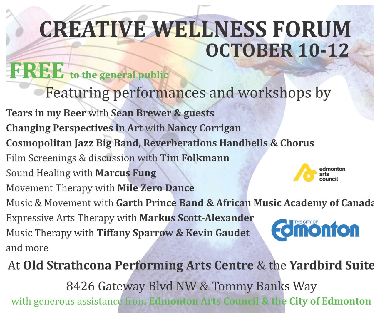 We are very pleased to be presenting a weekend devoted to arts, healing, and wellness. This event will be free to the general public as a result of generous support from the Edmonton Arts Council & the City of Edmonton. featuring Tears in my Beer with Sean Brewer & special guests Maria Dunn, Jay Gilday, and Dana Wylie Changing Perspectives in Art with Nancy Corrigan Cosmopolitan Jazz Big Band, Reverberations Handbells & Chorus Film Screenings & discussion with Tim Folkmann (at Yardbird Suite on Saturday & Sunday afternoons) Sound Healing with Marcus Fung Movement Therapy with Mile Zero Dance Music & Movement with Garth Prince Band & African Music Academy of Canada Expressive Arts Therapy with Markus Scott-Alexander Music Therapy with Tiffany Sparrow & Kevin Gaudet Stories of Therapeutic Arts with Jen Vegt
