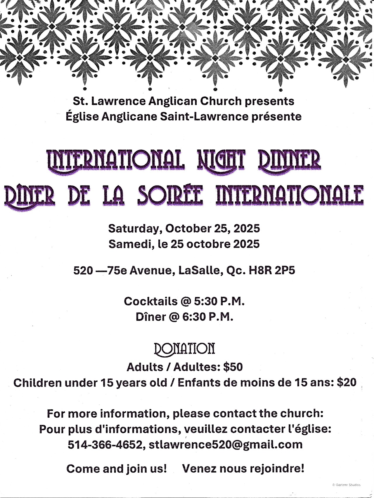 St. Lawrence Anglican Church presents the return of its Thirty-eighth Annual International Night Dinner on Saturday, October 25th, 2025, at the church, located at 520 – 75th Avenue, LaSalle. Cocktails will be served at 5:30 pm, and dinner will be served at 6:30 pm. Admission for adults will be $50.00 and entry for children under 15 years old will be $20.00. For more information, please get in touch with the church at 514-366-4652 or stlawrence520@gmail.com.