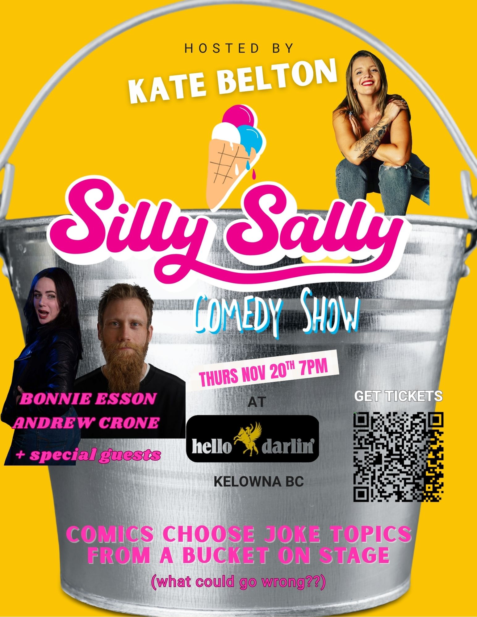 Silly Sally is BACK with an extra silly show for you this month! This month we’ll have touring headliner Andrew Crone, hilarious song and jokestress Bonnie Esson, and more bringing the silliness to the Hello Darlin’ stage and this time with a TWIST!! For the first time in Silly Sally history, we’ll be introducing THE BUCKET. What is the bucket you ask?? WELL it is home to joke topics, audience questions, and other prompts which the comedian on stage will have to choose from during their set! Do you have a burning question you’d like to hear a comic answer? Do you need advice? Do you want to hear a comic make up a joke about a topic on the spot while they’re in front of you? Then come to this show and drop something in the bucket!! This show is gonna be extra silly, and is sure to be memorable. Grab your pals and get tix, the last two shows have sold out!! Doors at 6, show at 7 Entry to the show is via Cannery Lane behind BNA!! BYE FOR NOW SEE YOU SOON!!