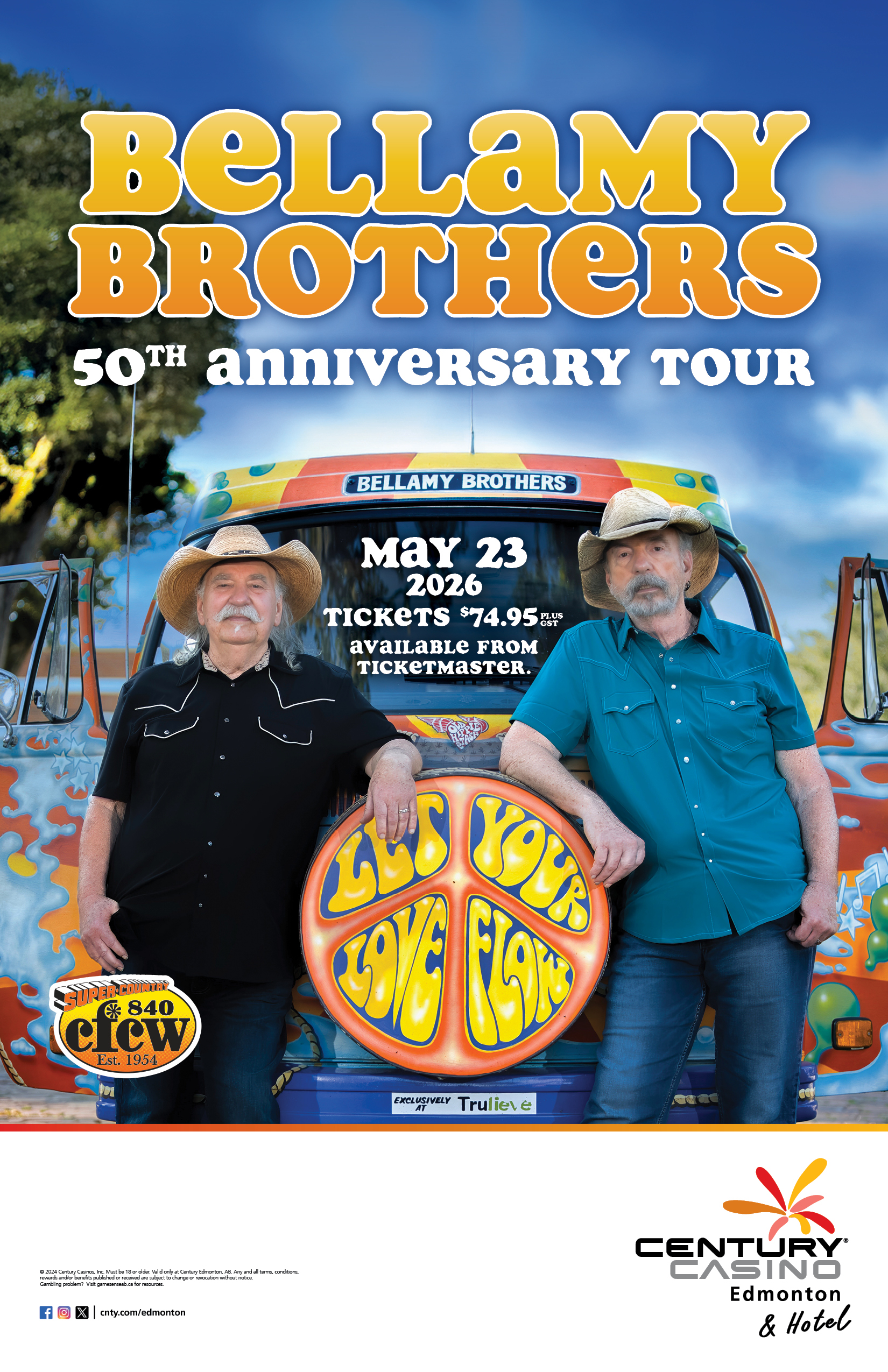 Get ready for an unforgettable evening of classic country music! Century Casino Edmonton is thrilled to present The Bellamy Brothers, live in concert on May 23, 2026. Known for their legendary hits like “Let Your Love Flow” , “Redneck Girl”, “Old Hippie”, and “Dancin Cowboys” Timeless tracks that shaped country music. With Over 40 years in the music they have garnered 20 No.1 Songs and 25 Top 10 Singles. The Bellamy Brothers No 1 Song Let Your Love Flow was featured on the Bud Light Super Bowl Commercial in last years Super Bowl and this years World Series. They have multiple nominations for CMA and ACM awards and have International success, with concerts and fans spanning the globe. Don’t miss this chance to see one of country musics most iconic duos perform their timeless classics live on stage. Secure your tickets today and join us for a night of dancing and a night to remember!