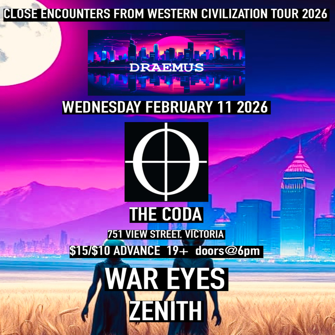 DRAEMUS THE ALIEN Inter-Dimensional Alien Rockstar CLOSE ENCOUNTERS FROM WESTERN CIVILIZATION TOUR 2026 at THE CODA VICTORIA https://linktr.ee/draemus Wednesday February 11 2026 DRAEMUS WAR EYES ZENITH $10 Advance tickets/$15 at doors Doors at 06:00PM 19+ THE CODA 751 View St Victoria PURCHASE TICKETS(AVAILABLE DEC 1st): https://gotothecoda.com./show/dreamusandfriends_11feb26 EXPERIENCE THE LEGENDARY ADVENTURE OF LOVE, DEATH, TRAGEDY & RISING EVIL IN THE GALAXY. EPIC & POWERFUL ALT/ROCK/EDM/INDUSTRIAL about ICONIC ALIEN SCI-FI SAGA DRAEMUS WILL OFFER YOU AN IMMERSIVE EXPERIENCE OF STORY & MUSIC. Draemus has been featured on mainstream radio X92.9 Calgary/X100.7 Red Deer, CJSR 88.5 FM Edmonton, CJSW 90.9 FM Calgary, K94.3 Rocks Celina Ohio, PopCan Radio & Banks Radio Australia. Draemus is an Inter-Dimensional Alien who offers a unique Alternative/Electronic experience from other worlds and dimensions. When visiting earth Draemus performs live music from Edmonton, AB. Draemus is known in Edmonton for strange live performances, unique music and social media entertainment.