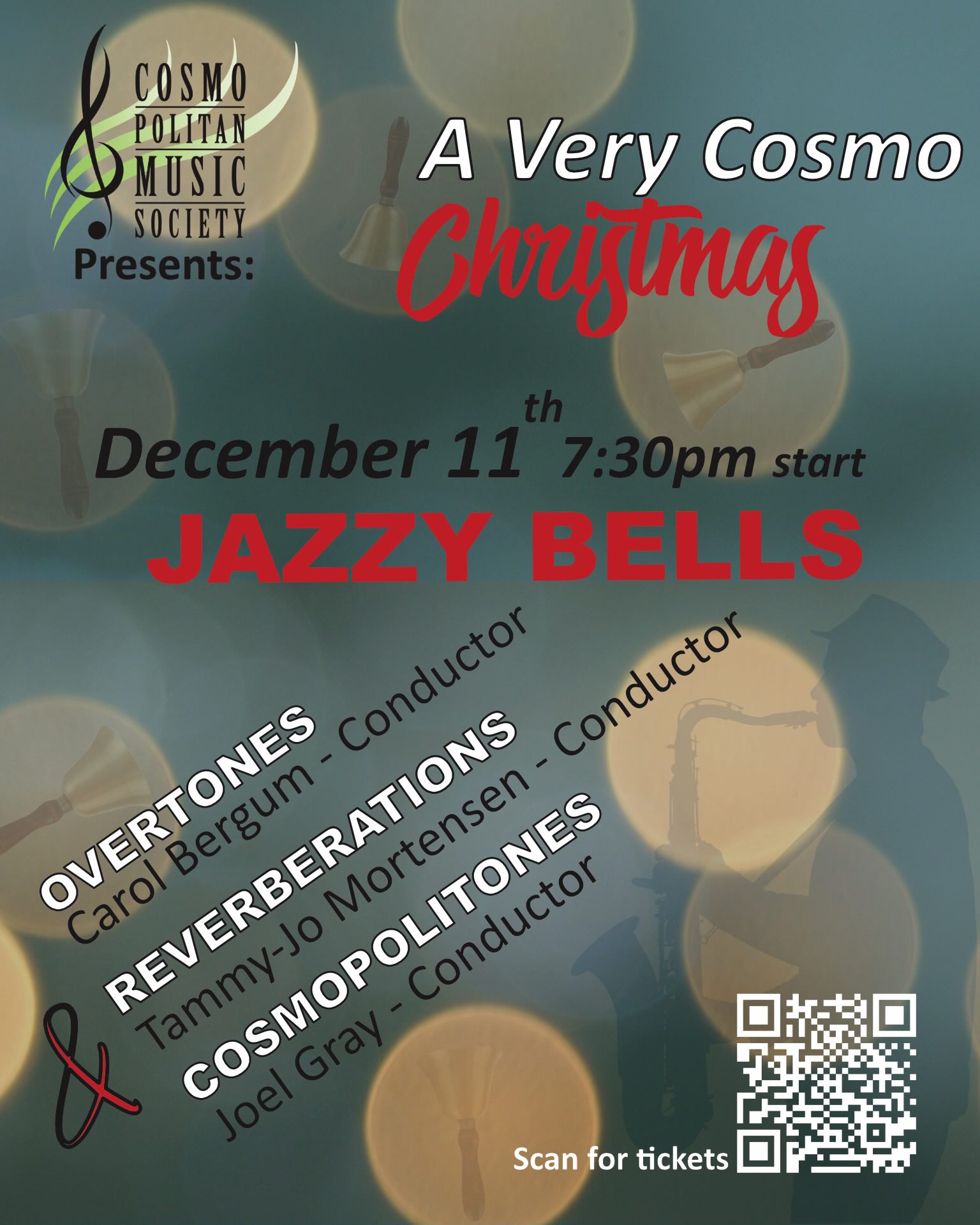 Join us for a very Cosmopolitan Christmas concert. Jazzy Bells features the Cosmopolitones Jazz Big Band and both Cosmo handbells ensembles: Overtones & Reverberations. Cosmopolitones conducted by Joel Gray Overtones conducted by Carol Bergum Reverberations conducted by Tammy-Jo Mortensen