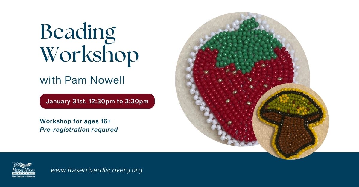 Join a hands-on beading workshop with Métis/Swampy Cree/Ojibwe artist Pam Nowell! In this 3-hour session, Pam will guide you through beading techniques as you create your own piece. You’ll bead a project of your choice, either a striking strawberry or a delightful mushroom. All materials and tools are provided. Pre-registration is required. WHAT: • Learn flat-stitch beading techniques • Bead your own strawberry or mushroom to take home! WHO: This workshop is intended for participants 16 years of age and older. WHEN: January 31st, 12:30pm – 3:30pm WHERE: Fraser River Discovery Centre COST: • Early Bird (until Jan 10th) – $40 • Regular (after Jan 10th) – $45 • Student (Student ID Required), Senior (65 and older), or Member – $40