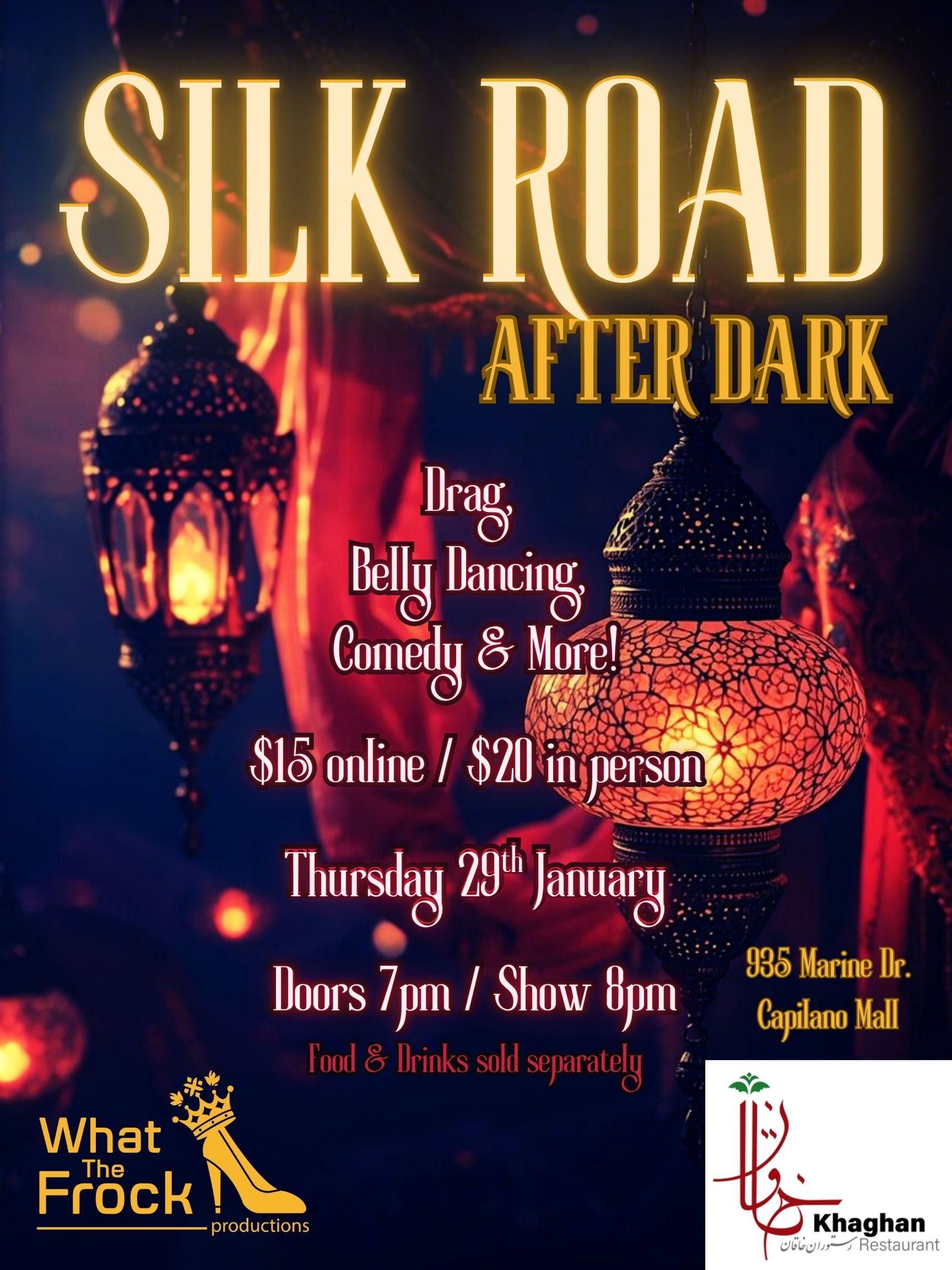 Get ready for a wild night of drag, belly dancing, and laughs at Silk Road After Dark in North Van! Silk Road After Dark Get ready for an unforgettable night in North Van! Experience a wild mix of drag performances, sizzling belly dancing, and hilarious comedy. This event is the perfect way to spice up your evening with vibrant entertainment and good vibes. A cultural explosion of Middle Eastern and Desi performances, and a sprinkle of British humour. Don’t miss out on the fun—come join the party at Silk Road After Dark! The famous Khaghan Restaurant is opening it’s doors to the queer arts and we’re coming to slay! Come early to fill up on their beautiful cuisine and delicious cocktails.