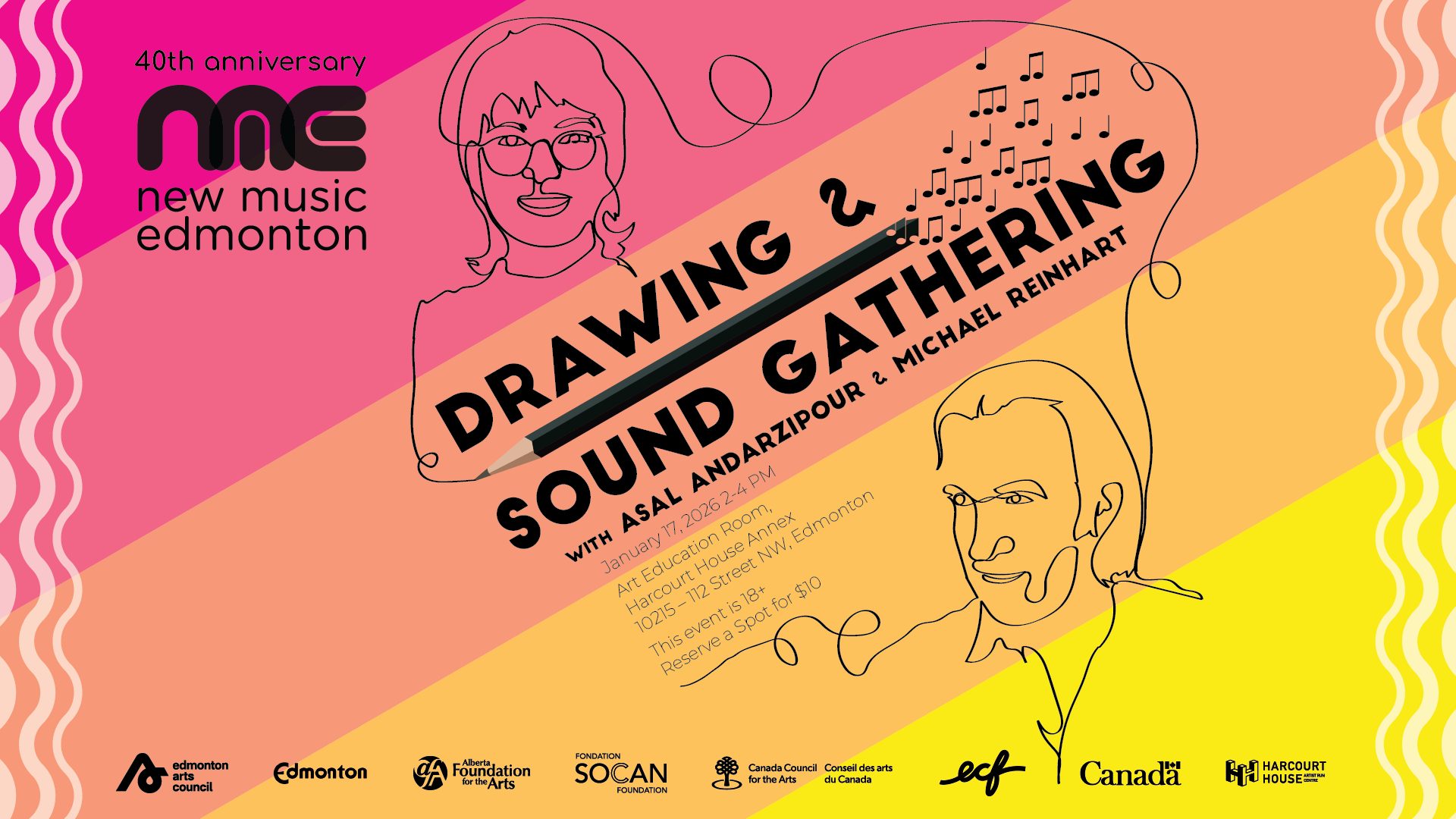 New Music Edmonton presents a Drawing and Sound Gathering. We’ll have all the paper, pastels, pencils, crayons and other stuff you could ask for, and some incredible, live sound to inspire you. Your hosts will be amazing artist Asal Andarzipour and brilliant sound artist Michael Reinhart. You can sit and draw, colour to your heart’s content, just like when you were a kid! Thank you to Harcourt House Artist Run Centre for making this event possible! All art materials will be supplied by Harcourt House and New Music Edmonton. This event is 18+. Attendance is limited to 15, and pre-registration is required.