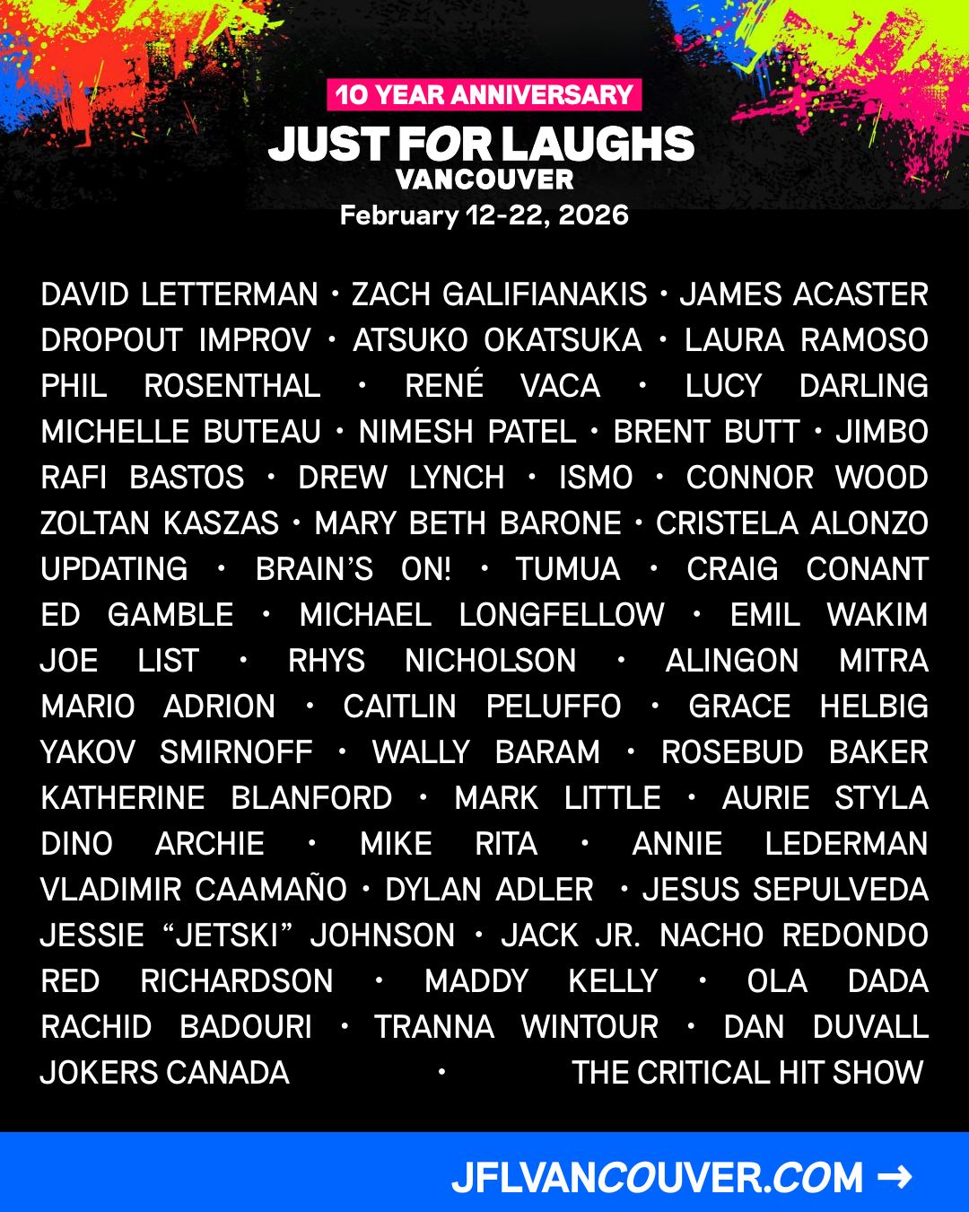 This year, Just For Laughs is celebrating a major milestone: 10 years of bringing top-tier comedy to the West Coast as Vancouver’s Just For Laughs festival! For over a decade, Just For Laughs VANCOUVER has been Western Canada’s biggest comedy festival, and they’re marking this anniversary with the kind of world-class talent and electric energy that has defined us from day one. Introducing Your Just For Laughs Vancouver 2026 Festival Lineup: https://jflvancouver.com/lineup/