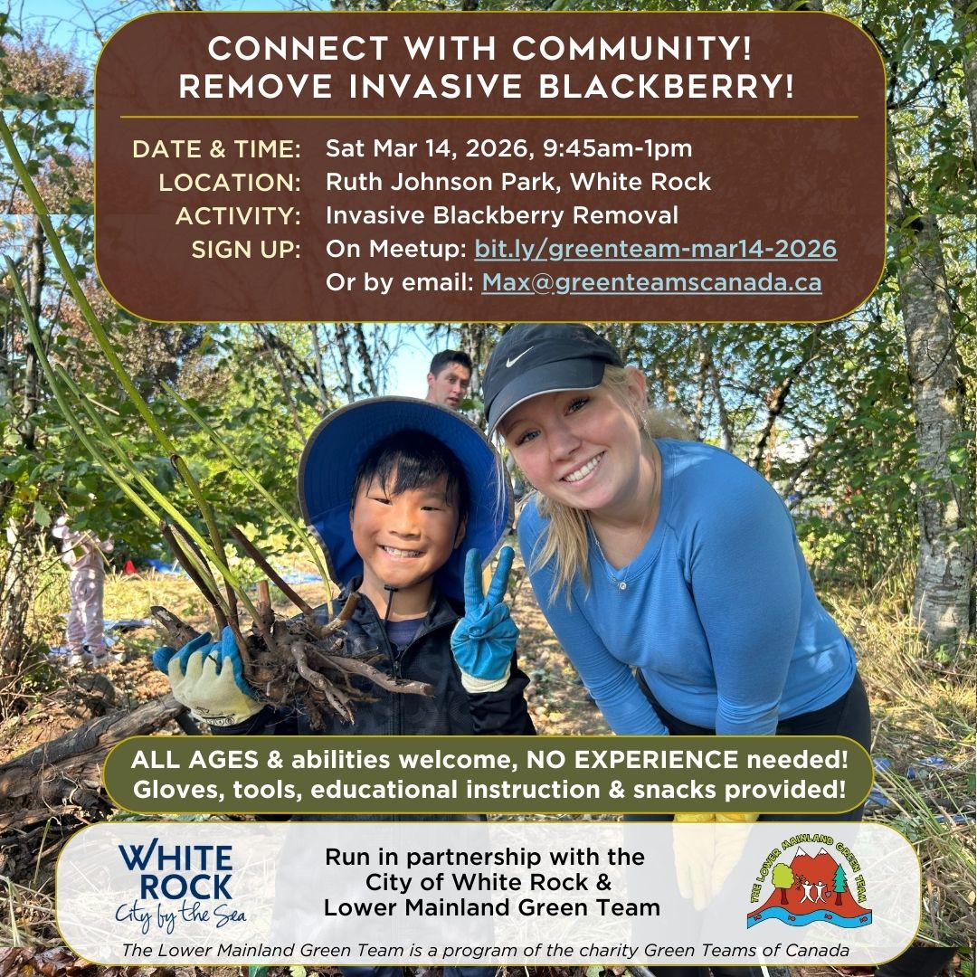 🌿Sat. Mar. 14th, 9:45-1PM! Join your community in nature & help us steward Ruth Johnson Park in White Rock! 🌿 🙋♀️ NO Experience Needed! All ages & abilities welcome! Bring your friends & family! Come for as long or as little as you’re able! 🌿 Learn about invasive plants like Himalayan Blackberry as we take action to remove them, creating space for native plants to flourish and revitalize Ruth Johnson Park! 📅 When: Sat Mar 14th | 9:45AM – 1:00PM, Rain or Shine! 🌦️ 🧤 What: Remove invasive blackberry to help native plants thrive! 📍 Where: Ruth Johnson Park, 14600 North Bluff Rd, White Rock 🧰 Provided: Tools, gloves, snacks, and educational instruction! ✨ You wear: Long sleeves, long pants & closed-toe shoes. 👉 More Info & Sign-Up: bit.ly/greenteam-mar14-2026 📧 Questions? Email: Max@GreenTeamsCanada.ca ✨ Why join? ✔️Meet awesome new people! 🤝 ✔️Improve mental health and well-being in nature 🌿 ✔️Restore a green space & support biodiversity 🌳 ✔️Enjoy DELICIOUS snacks 🍪🍎 ✔️Earn volunteer hours ⏲️ ✔️ HAVE FUN making a real difference!😄 👋 Whether you’re looking for fresh air, exercise, volunteer hours, or a chance to meet like-minded people, there’s something in it for everyone! 🤝 This activity is being organized thanks to partnership between the City of White Rock and the Lower Mainland Green Team!