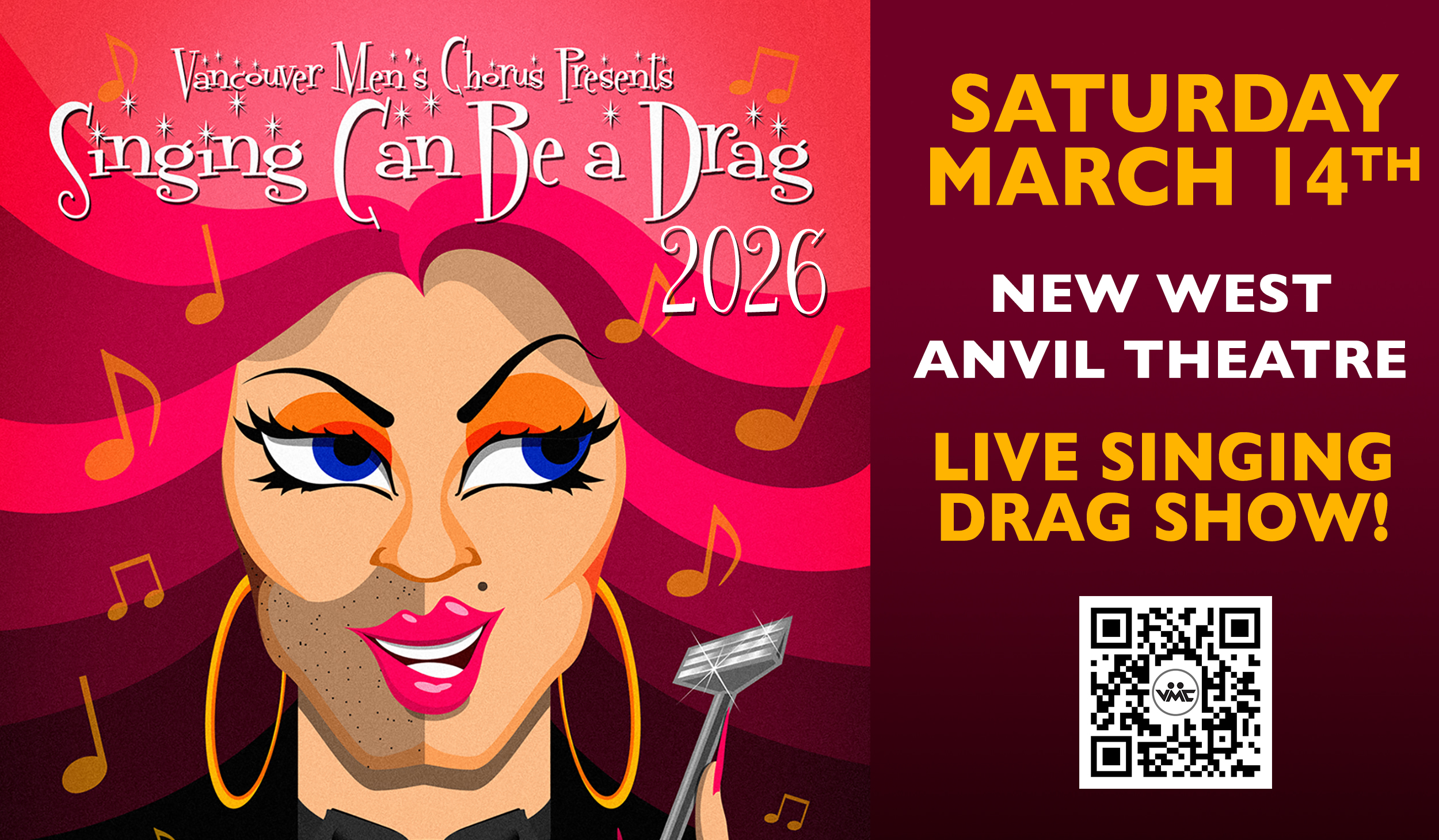 Presented by the Vancouver Men’s Chorus Returning for its 18th inception, the falsettos are high… and the heels even higher! Members of the VMC don their finest frocks in this unique LIVE singing drag extravaganza. With each performance prepared by the queens themselves, gird your loins for an evening of bombastic show tunes, heartfelt ballads, high energy pop anthems, and everything in between!
