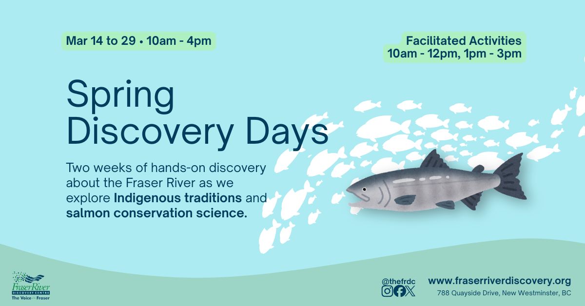 Spring Discovery Days Join us for two weeks of hands-on discovery as we explore the lifeblood of our region: the mighty Fraser River. Dive into the stories that flow through our waters, bringing together Indigenous traditions and salmon conservation science. WHAT: Mar 14th to 21st: Roots of the Fraser Learn about trade routes and trade in the river basin. Explore stream restoration to help our salmon reach their spawning grounds in our facilitated programs. Test your skills with our Indigenous language matching game, and add your unique strand to our communal netting art installation—a giant “Web of Life” that grows all week long! Mar 22nd to 29th: Then & Now: Learning from the River Become a junior biologist and learn the vital skill of salmon tagging. Compare different fishing methods in “Tackle(box) in Time” in our facilitated programs. Uncover hidden belongings in our archaeology dig; challenge yourself to match the vessels of the Fraser with their uses, from the past to the present! WHEN: March 14th – 29th, 10:00am – 4:00pm – Facilitated activities: o Trading trail (Mar 14th to 21st, 10:00am – 12:00pm) o Stream restoration (Mar 14th to 21st, 1:00pm – 3:00pm) o Salmon tagging (Mar 22nd to 29th, 10:00am – 12:00pm) o Tackle(box) in Time (Mar 22nd to 29th, 1:00pm – 3:00pm) – Self-guided activities: 10:00am – 4:00pm WHERE: Fraser River Discovery Centre, 788 Quayside Drive, New Westminster, BC COST: Includes admission to the Discovery Centre. Specific costs are listed below: – Family Ticket ($20.00) – for 2 adults and up to 4 children – Adult Ticket ($8.00) – adult 19 and older – Senior Ticket ($6.00) – senior 65 and older – Student Ticket ($6.00) – student ID required – Child ticket ($5.00) – children aged 3-12 – Children 2 and under register for free Caretakers are asked to remain with their children for the duration of their visit.