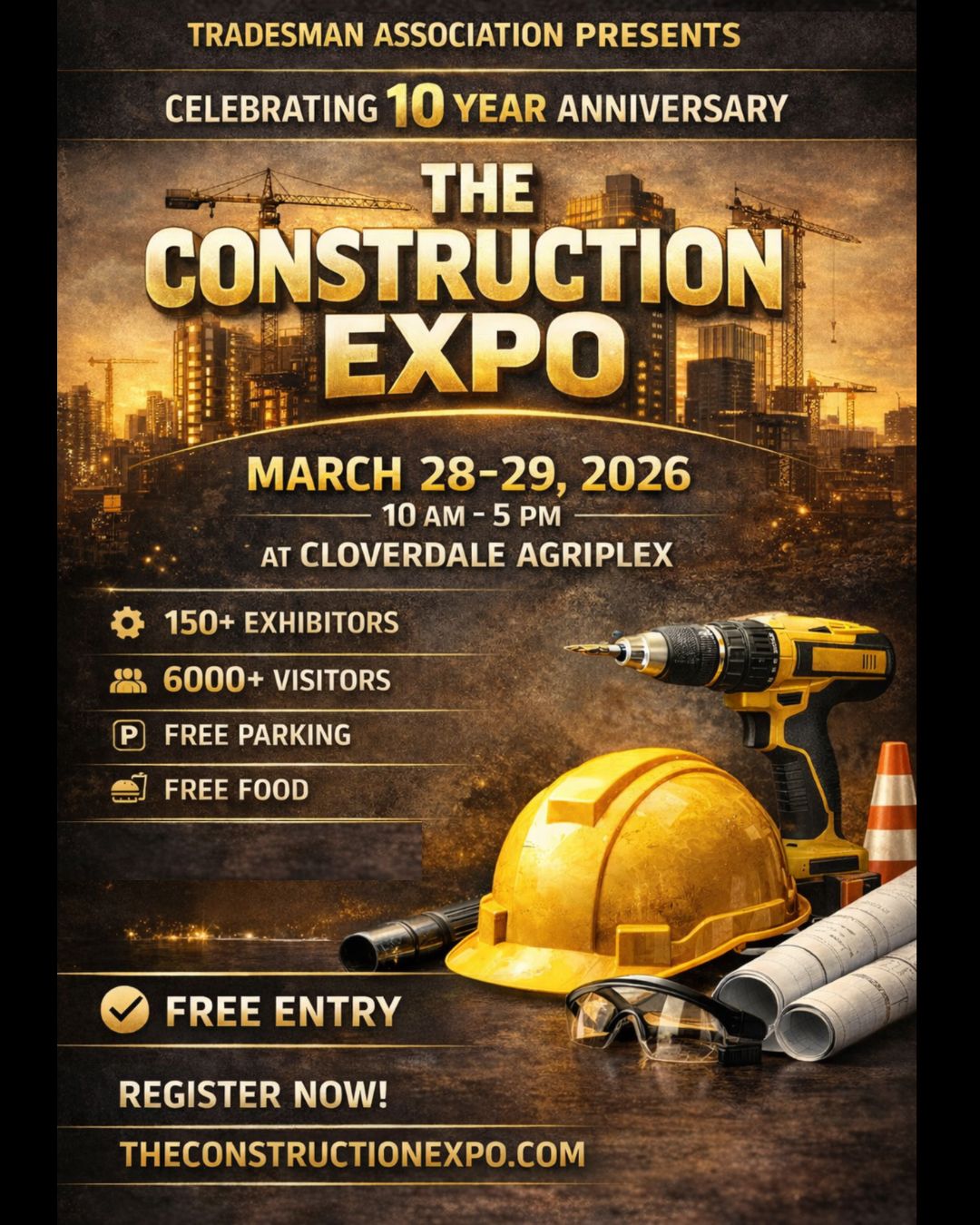 What: The 10th Annual Construction Expo is a premier event bringing together builders, contractors, suppliers, developers, and construction professionals from across British Columbia. Attendees can explore the latest construction products, technologies, and services while networking with industry leaders. The event features exhibitor booths, educational seminars, industry demonstrations, complimentary food, door prizes, and opportunities to connect with professionals across the construction sector. When: March 28-29, 2026 Time: 10:00 am – 5:00 pm Where: Cloverdale Agriplex – 17798 62 Ave, Surrey Tickets/Admissions: Free admission