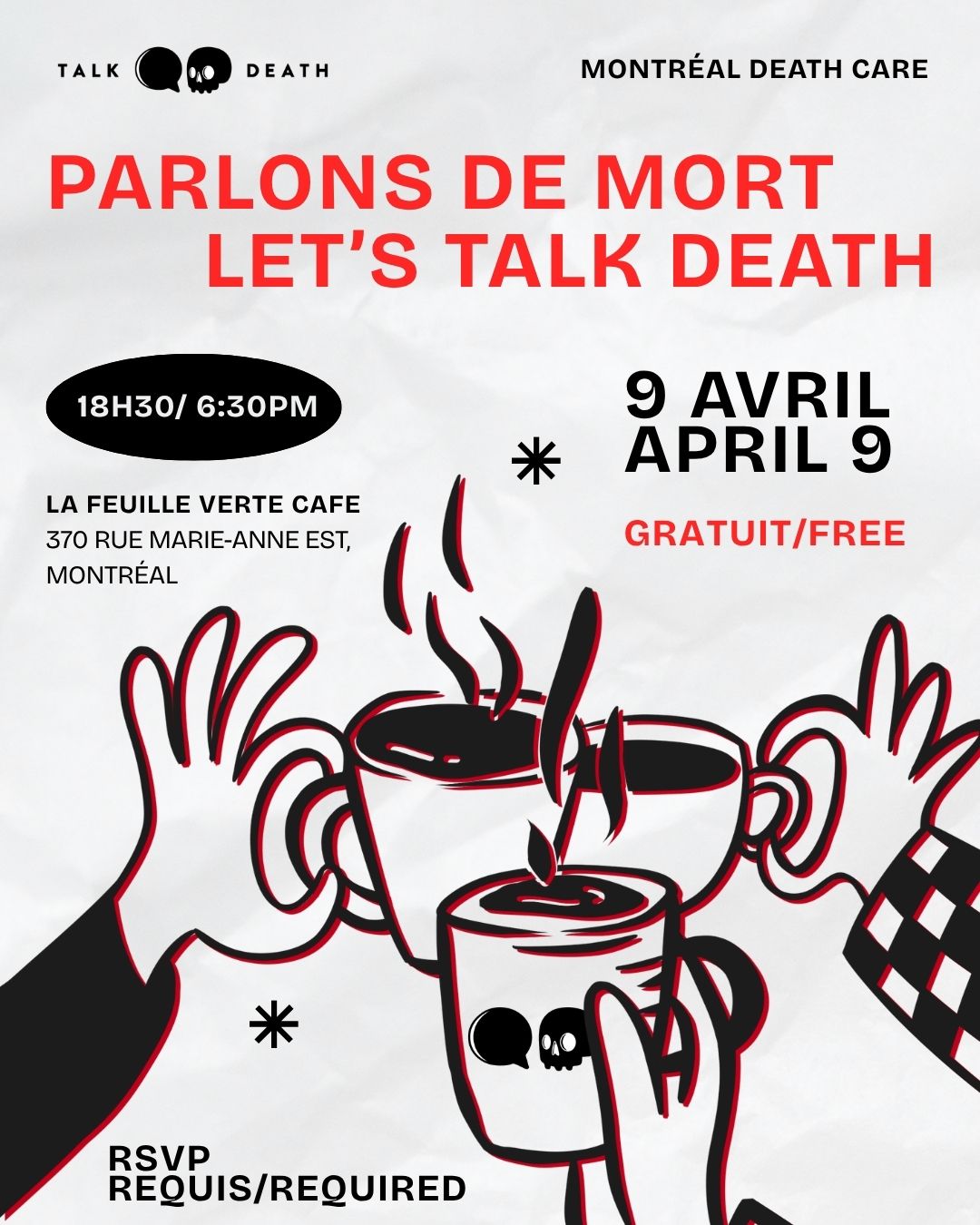 Discussion guidée, mais non formelle, sur tous les sujets liés à la mort et au deuil/Lightly guided discussion on topics related to death Parlons de mort!/ Let’s Talk Death! [Francais suivra] Lightly guided discussion on all topics related to death and dying Open to death care workers and the general public, offering a space to gather and be in community This is not a grief support group Presented by: TalkDeath + Montréal Death Care La Feuille Verte Cafe April 9 6:30pm ———————————————- Présenté par: TalkDeath + Montréal Death Care Discussion guidée, mais non formelle, sur tous les sujets liés à la mort et au deuil Ouvert aux professionnels du milieu funéraire et à toute personne gravitant autour de cet univers, dans un esprit de rencontre, d’échange et de réseautage. Il ne s’agit pas d’un groupe de soutien au deuil La Feuille Verte Cafe 9 Avril 18h30