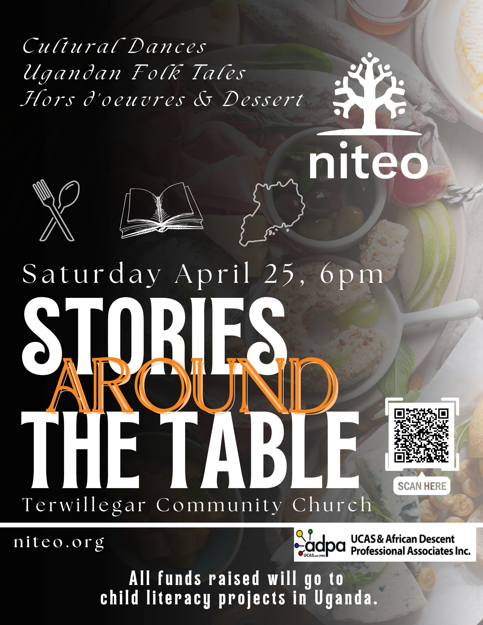 Join NITEO as we gather ’round the table for an evening of community, culture, and celebration! Enjoy delicious hors d’oeuvres & desserts and a program packed to the brim with Ugandan cultural dances & storytelling as well as updates and stories about NITEO’s literacy work in Uganda. 6pm: Hors D’Oeuvres & Desserts 6:30pm: Program Begins 8:30pm: Program Concludes All proceeds from Stories Around The Table will go towards shipping our 11th container of books to Uganda this year!