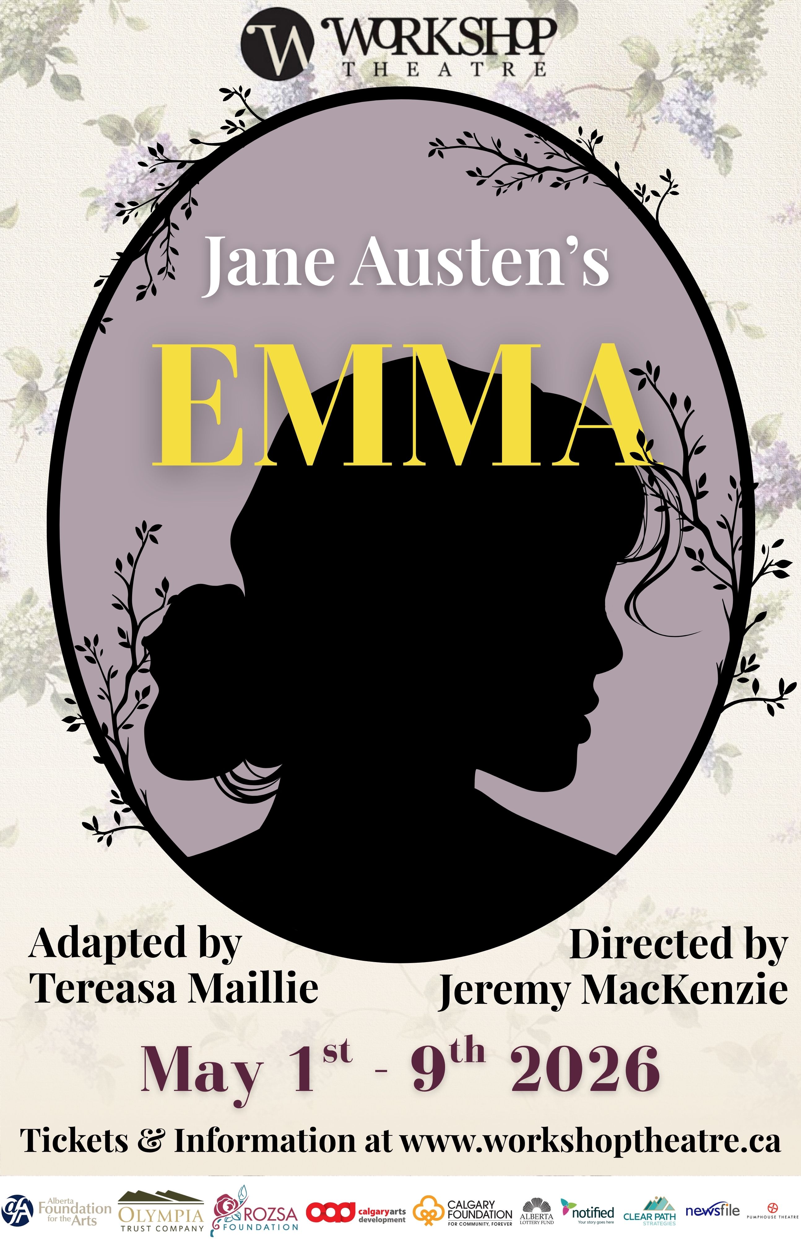 Workshop Theatre proudly presents: Jane Austen’s Emma Adapted by Tereasa Maillie Directed by Jeremy MacKenzie In this adaptation of Jane Austen’s beloved novel, Emma, audiences are invited into a world of charm, wit and social intrigue. At the heart of the story is Emma Woodhouse – clever, headstrong and determined to play matchmaker among her friends and neighbours. But as her well-intentioned meddling leads to unexpected consequences, Emma must confront the complexities of love, friendship and self-discovery. Running May 1st to 9th 2026 Location: The Pumphouse Theatre, Joyce Doolittle Theatre 2140 Pumphouse Ave SW, Calgary, AB T3C 3P5 Tickets: General Admission: $28.00 Student/Senior Admission: $25.00 Ticket prices include GST and fees. Please note: tickets are non-refundable. For more information and to purchase tickets, please visit our website: https://www.workshoptheatre.ca/janeaustensemma Questions? Please email us at info@workshoptheatre.org
