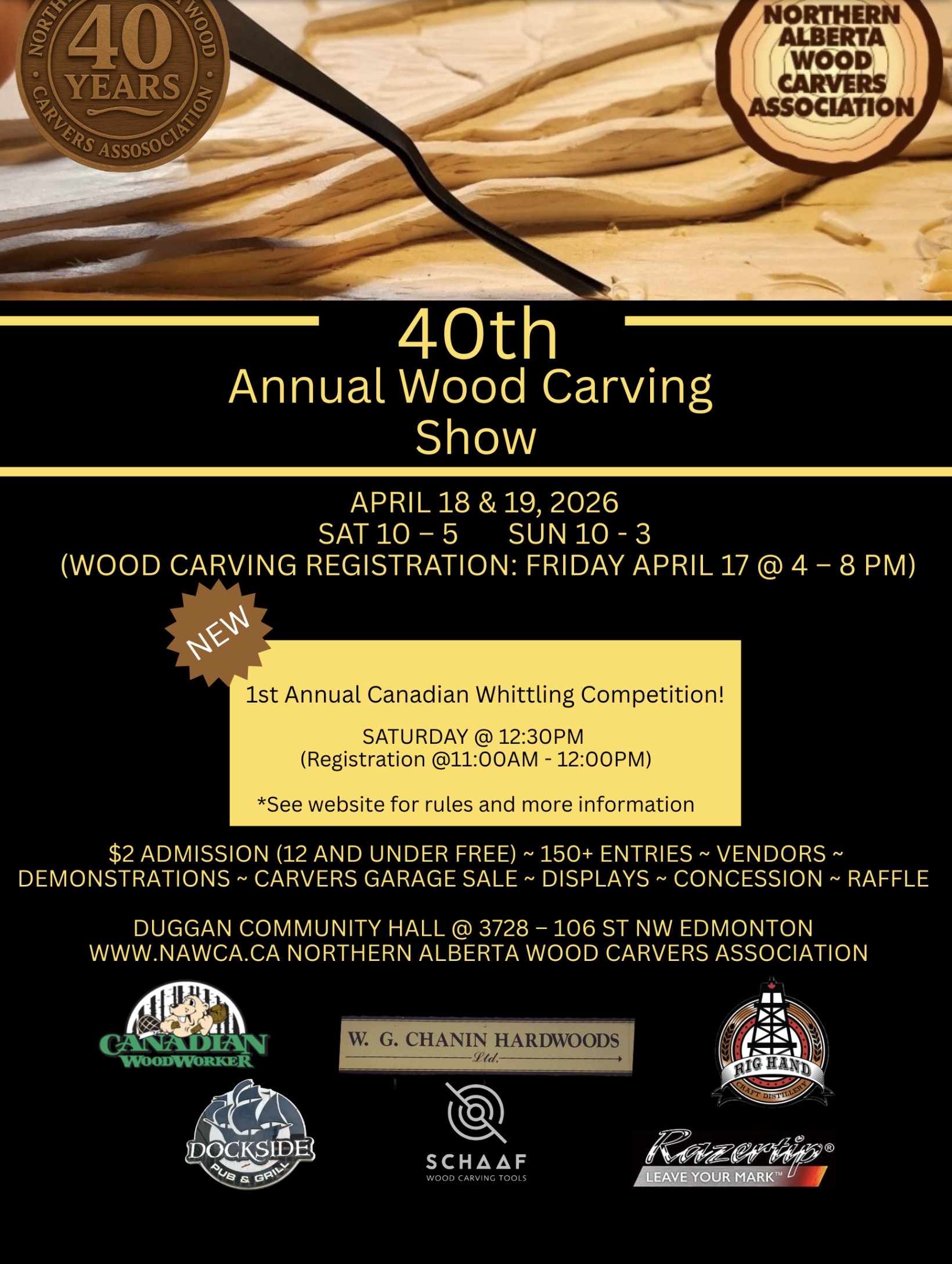 Join us for a weekend celebrating craftsmanship at the Edmonton Carving and Whittling Show! Experience the art of woodcarving up close with talented artisans showcasing their skills, unique handmade pieces, and live demonstrations throughout the event. Enjoy both a Carving Competition and a Whittling Competition (Saturday at 12:30pm), where participants of all skill levels can participate. Browse the Carvers Garage Sale and grab a bite at the concession. Registration to enter competition Friday April 17 Whittling Competition Saturday April 18 See website for rules and registration details and forms