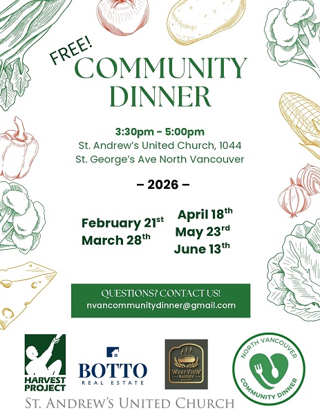 Free! Run entirely by youth in North Vancouver & co-sponsored by St. Andrew’s United Church and North Vancouver Community Dinner. You are warmly invited for tea & coffee, a home cooked main course, dessert, and conversation with others in the community. For the full calendar of dinners, please visit https://www.st-andrews-united.ca/events/. Contact: nvancommunitydinner@gmail.com Facebook event: https://www.facebook.com/share/1GqwVjYVCz/