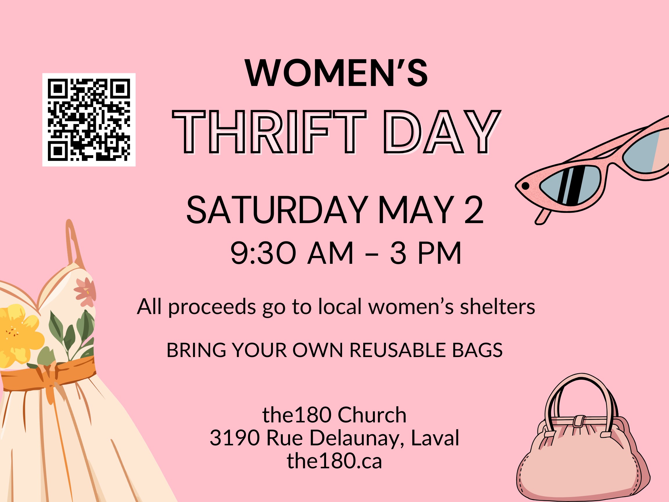 The180 Church is excited to support three local women’s shelters by raising funds through a Women’s Thrift Day! All proceeds from this event will go to three local women shelters in Laval: May 2, 2026 | 9:30 AM – 3 PM The180 Warehouse 3190 Rue Delaunay, Laval