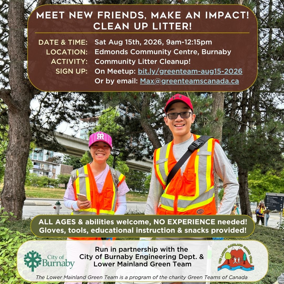 ๐ MORE INFO & SIGN UP ON MEETUP: bit.ly/greenteam-aug15-2026 Connect with your community while cleaning up litter on Sat. Aug 15th, 9am-12:15pm at the Edmonds Community Centre in Burnaby! ๐โโ๏ธ No experience needed! All ages & abilities welcome! Bring your friends & family! Come for as long as you are able! This activity is run in partnership between the Lower Mainland Green Team & the City of Burnabyโs Engineering Dept. ๐ When: Sat. Aug 15th | 9:00AM โ 12:15PM, Rain or Shine! ๐ฆ๏ธ ๐๏ธ What: Cleaning up Litter to keep our community & environment clean & safe! ๐ Where: Edmonds Community Centre, 7433 Edmonds St., Burnaby ๐งค Provided: Gloves, litter pickers, safety vests, buckets, snacks, & educational instruction! ๐ You bring: Bright, visible clothing, closed-toe walking shoes, a backpack & water ๐ MORE INFO & SIGN UP: bit.ly/greenteam-aug15-2026 ๐ง QUESTIONS? Email: Max@GreenTeamsCanada.ca โจ Why join? โ๏ธ Meet new people! โ๏ธ Be the change you want to see & inspire others โ๏ธ Help reduce pollution & prevent litter from entering storm drains, streams, & the ocean! โ๏ธ Enjoy DELICIOUS snacks ๐ช๐ โ๏ธ Earn volunteer hours โ๏ธ Enjoy a walk in your community, rain or shine! โ๏ธ HAVE FUN & feel good making a visible, positive difference – fast! ๐ This is the third of FOUR community cleanups across Burnaby this summer! Check out burnaby.ca/cleanup for our last cleanup in Sept. too! Whether youโre looking for fresh air, exercise, volunteer hours, or a chance to meet like-minded people, thereโs something in it for everyone!