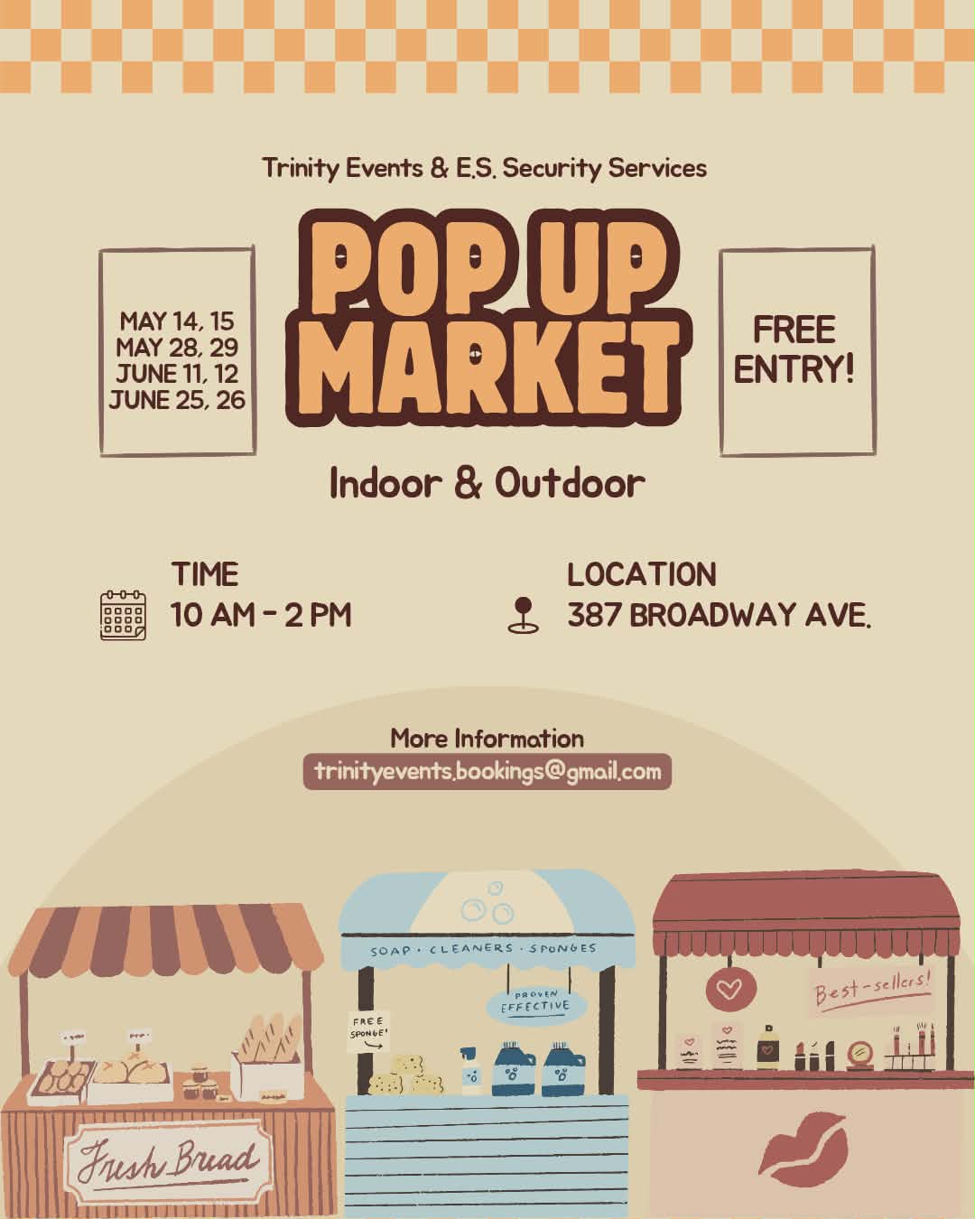 Pop Up Market coming to Broadway! Come shop for baked goods, food truck yummies, clothing, jewelry, toys, house decor, and more! We will be inside and outdoors. Save the Dates: May 14, 28, 29, and June 11, 12, 25, 26 from 10 – 2 pm! For more information: Email trinityevents.bookings@gmail.com